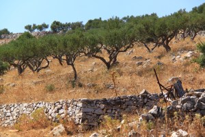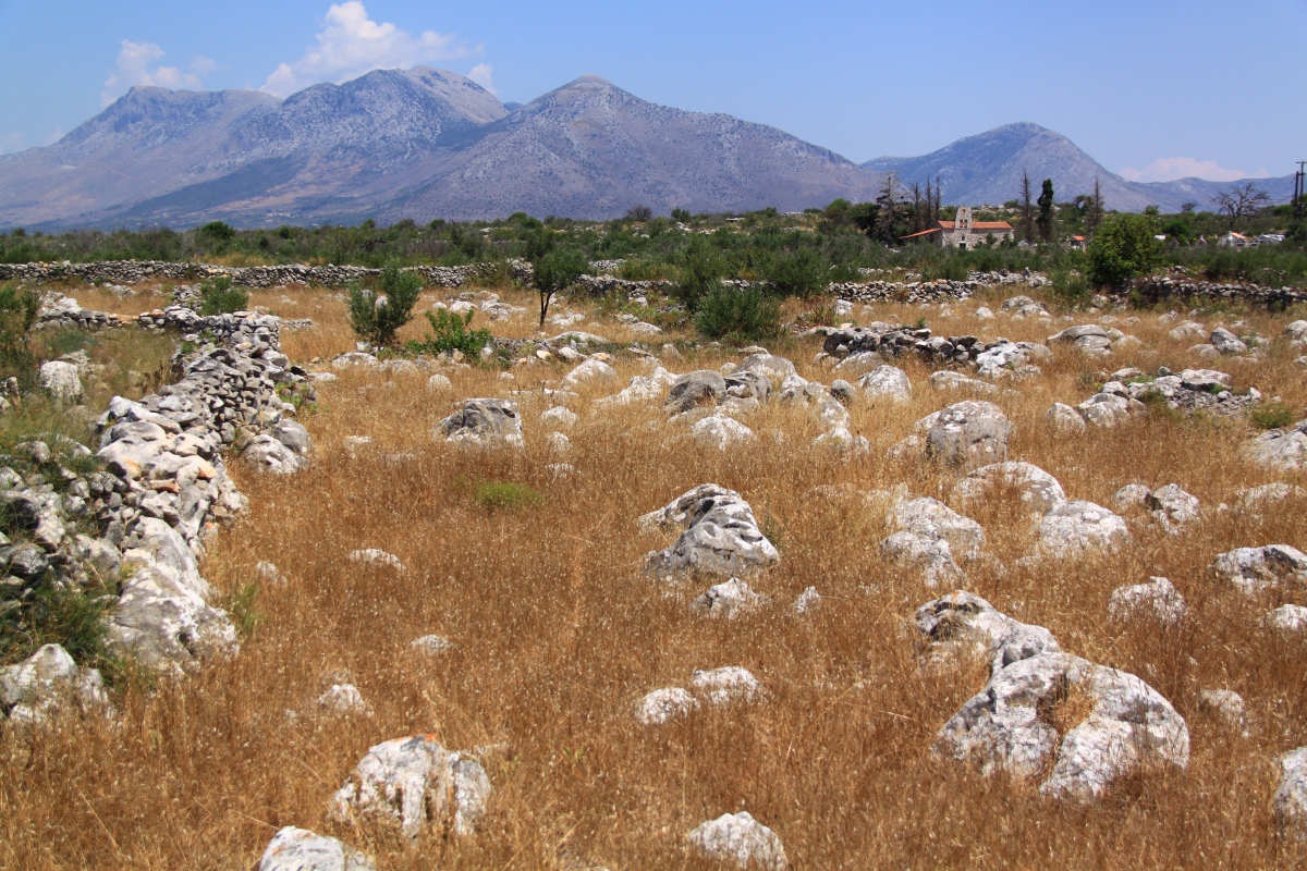 Typical landscape on the coastal plateau: rocky fields, stone walls, small churches, thorns and olives …. against a mountain backdrop