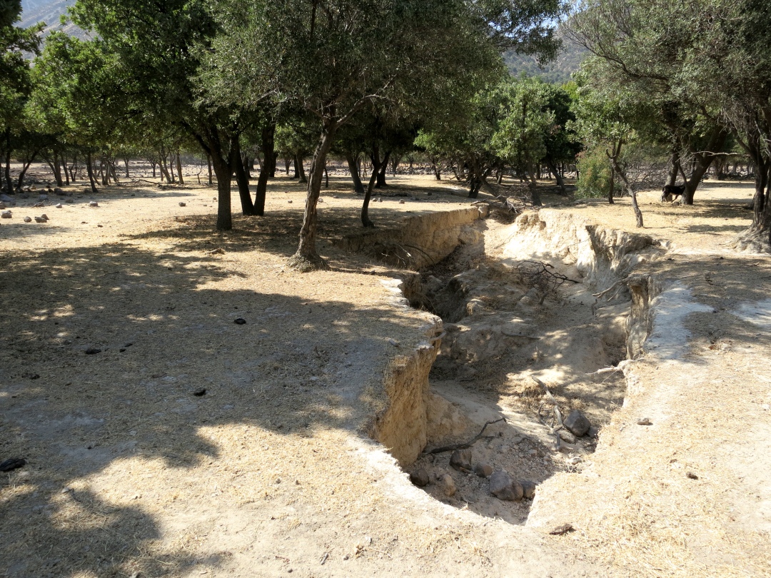 It was exhilarating! Double digression then a backtrack. Digression 1: We used to have a black cat which ran around like a made thing if the wind was strong outside. We used to say that it had the wind up its tail. I was like that on the walk back from Nikia. I had the wind up my tail. I was buzzing! Digression 2: I know how strong the wind can be on Nisyros because in May 2009 when we reached the top of Oros Divatis, the highest peak on the caldera rim, Enfys, (my late wife, for those who don’t know) was picked up by a dust-devil and thrown across the top. Fortunately she suffered no more than mild shock. Backtrack: The wind had been throwing spray over the harbour wall and all along the seafront before I left Mandraki. At Nikia several hours later, 415 metres higher and accelerated by the Venturi Effect, it was thrashing trees around and making walking difficult where it was funnelled . There were dust devils floating around the slopes and on the caldera floor but none did more than blind me with dust and caution me to stop and anchor myself more firmly to the ground.