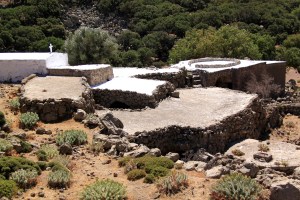 Once in the Nyfios valley the whole impression is of great antiquity. The tiny settlement is built into the rock and is basically underground with a small church at the core of it. The present buildings are fairly ‘modern’ on a historical timescale, probably going back only a few centuries (my guess) but there is evidence elsewhere in the valley of Neolithic settlement, with underground cisterns and a rock carved ‘grotto’ now a church. At the entrance to the settlement are Minioan ‘horns of consecration’, indicating that settlement predated what is there now.