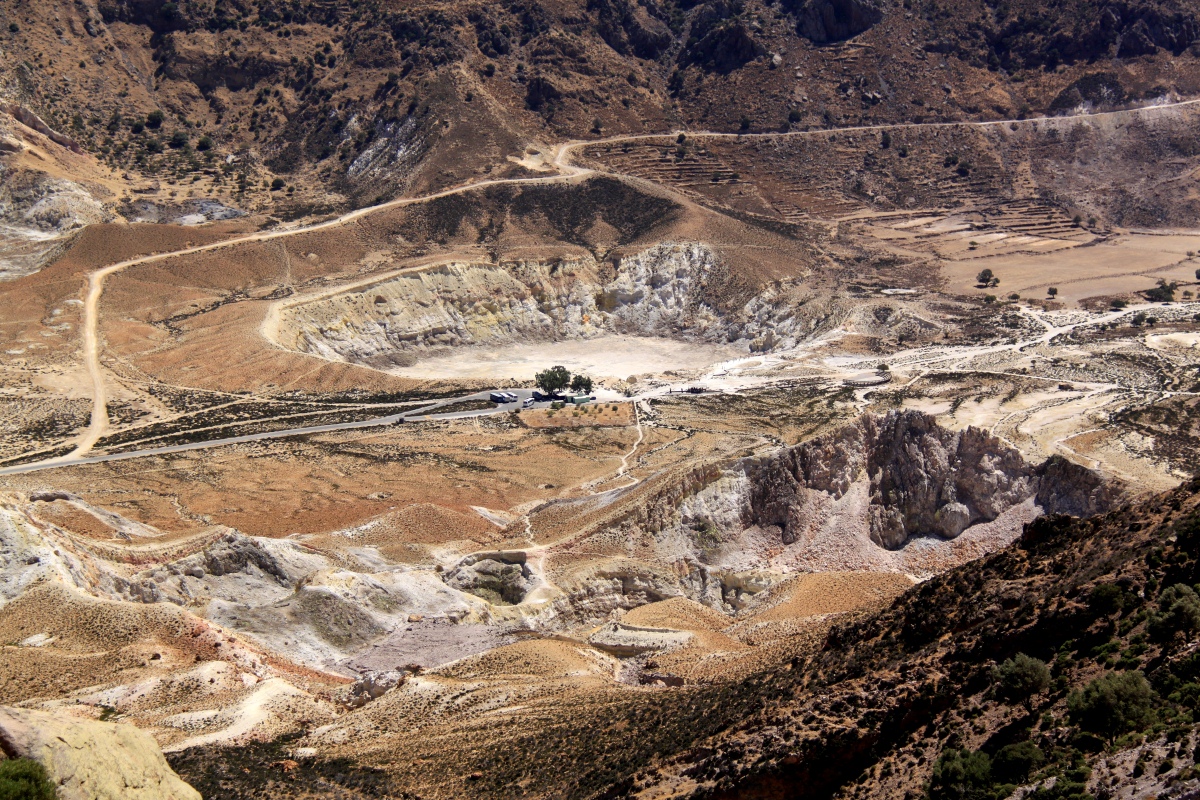 Walk to the end of the valley and the view is straight down into the main caldera, probably the best view point of the many craters at the western end of the caldera floor. But here is the contrast. The settlement is indeed ancient, evincing one of the oldest civilisations in Europe but the mountains and rocks which surround it are the newest in Europe. Geologists estimate that Nisyros was created by volcanic action 150,000 years ago with many of the rocks dating back only to further volcanic activity in what is classed as ‘pre-history’. The last few eruptions were ‘hydrothermal’ – mainly ash and gases rather than lava but they left huge deposits of pumice and similar material. The last major eruption on Nisyros was in 1888 and the last significant ‘activity’ was the Seismic Crisis of 2003.