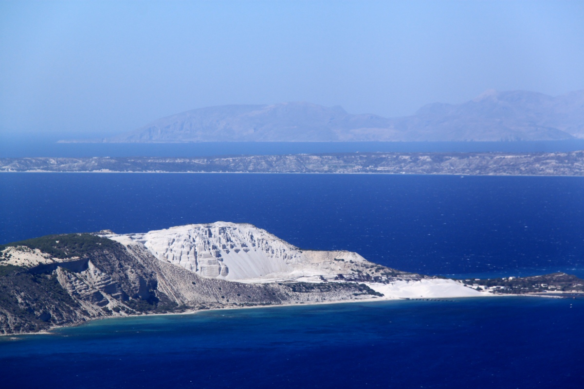 The return route is via a col alongside Oros Diavatis (‘oros’ means mountain). The impression of antiquity pervades that too with an ancient threshing circle at the highest point. It also affords views over the pumice-island of Yiali and Kos to Kalymnos beyond. Very dramatic. But I can’t help but be ambivalent about the pumice quarrying on Yiali. Operated by Lafarge it has a global market and certainly brings wealth to Nisyros, and to Greece, beyond tourism. The company’s claims of it being an ‘environmentally friendly’ operation somehow don’t seem to square with the visual impact. I spent part of my life finding ways to prevent such visual impact in the quarrying industry in South Wales but I guess things are different here. I don’t begrudge Nisyros the income from the royalties.
