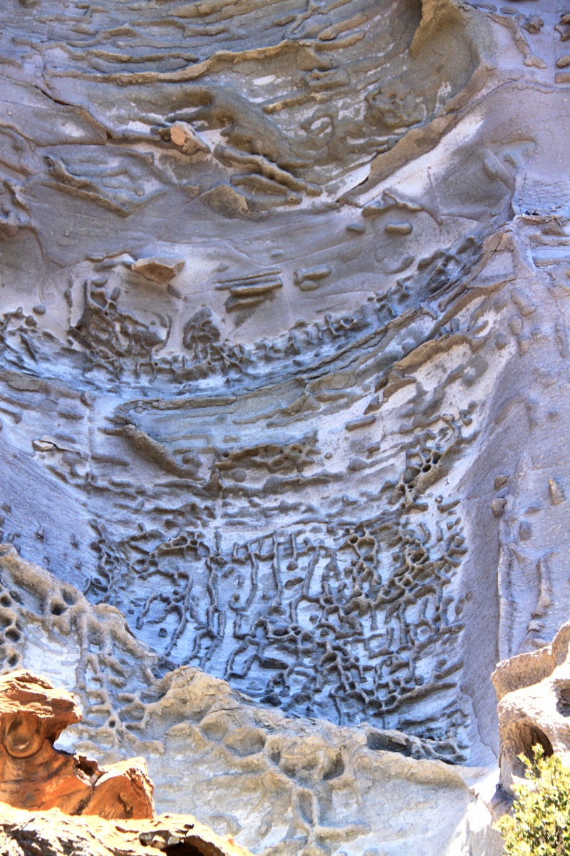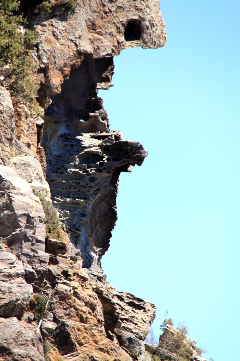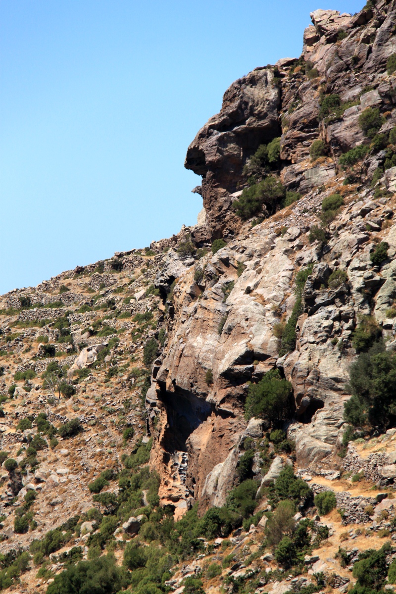 So, having done what I could from close to the path, and with plenty of time in hand, I decided to go ‘off-piste’ and climb up the side of the bubble to get shots from higher up. It was a combination of scrambling and climbing, in places trying to move more quickly than the looses scree and collapsing stone walls of terraces obeyed gravity and slid downwards. Every step and handhold had to be tested very gingerly before trusting it. Great fun and the reward was a perspective on the lava bubble probably not seen since the folk who lived up here abandoned the terraces and moved to where life was easier and safer.