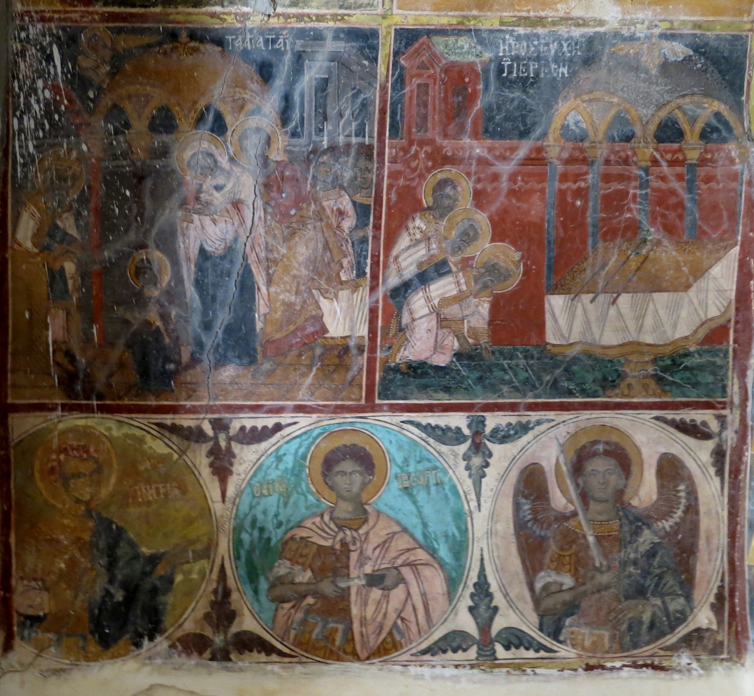 Like the Paleocastro, visiting Siones is like being in a time warp. It a small complex of tightly enclosed buildings clustered around a tiny multi-level courtyard or ‘Avli’. The earliest construction was obviously built onto a cave before it was added to and fortified. I don’t know how old it is but the frescoes in the church are said to have been renovated in 1733. The last couple of years the church has been in a very sorry state of repair with significant water damage from a cracked and leaking roof and evidence of rats having taken up residence. Very pleased to see that the roof has been repaired and the detritus and rat mess cleared from the inside. The frescoes are damaged but with the repaired roof hopefull will not experience further deterioration.