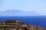Approaching Agia Irini there is the reminder of yet another way in which people made a living from the volcano. Perched on a headland looking out towards Tilos is the remains of a building which would once have housed some the workers in the sulphur exporting plant at the tiny harbour below. Built in 1879 it piped sulphur out of the crater over the rime of the caldera and down to a small processing plant at Agia Irini. It was then exported to other parts of the Mediterranean for treating vines to prevent disease. It lasted in operation only 10 years but the remains are still there, stark reminders that industrial dereliction is found in attractive locations too.