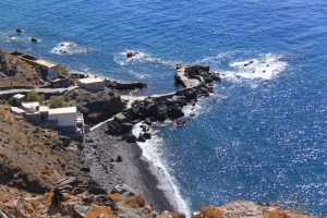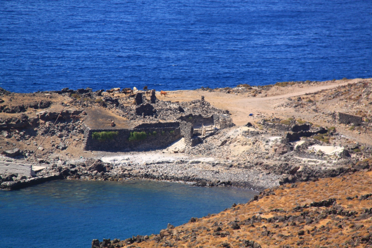 It clearly had not always been so. There was much evidence of settlement and terraced fields wherever the terrain would allow. Most of the steeper terraces were almost completely blocked by thorn scrub with stone built houses here and there. Having rounded one rocky headland I dropped down to a small area of less-overgrown and wider terraces which seemed to be devoid of settlement but turned out to have caves dug out of the pumice with stone-built fronts, the terraced fields simply continuing over the top.