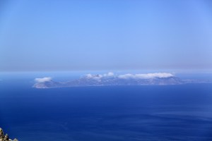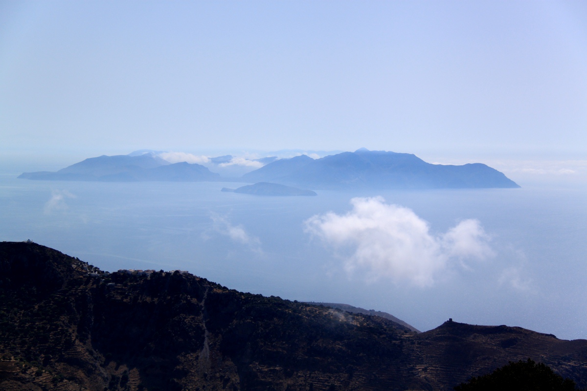 I climbed Oros Diavatis again, at just short of 700 metres the highest mountain on Nisyros. Once again it was cloudless and, with barely any breeze, it was hot going. The views from the top are great but on Saturday augmented by a strange weather phenomenon. The distant sky was almost opalescent blue and there were low-level clouds on Kos to the north and Tilos to the south, and the odd wisp of cloud below Nikia on the opposite side of caldera rim. Ethereal.