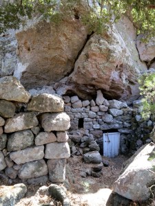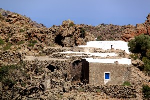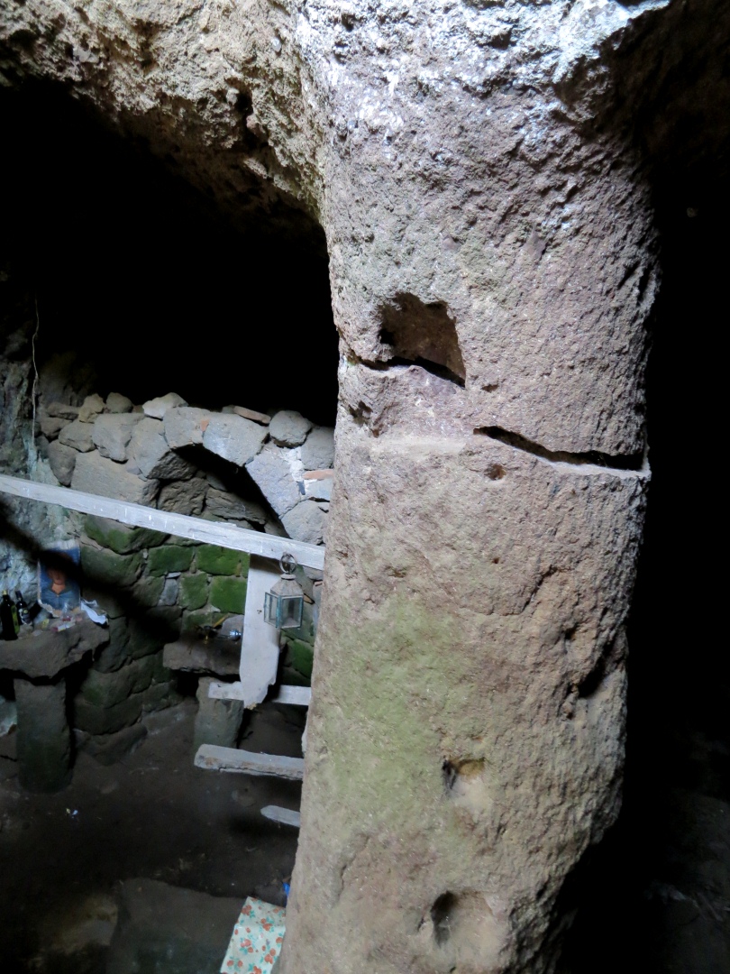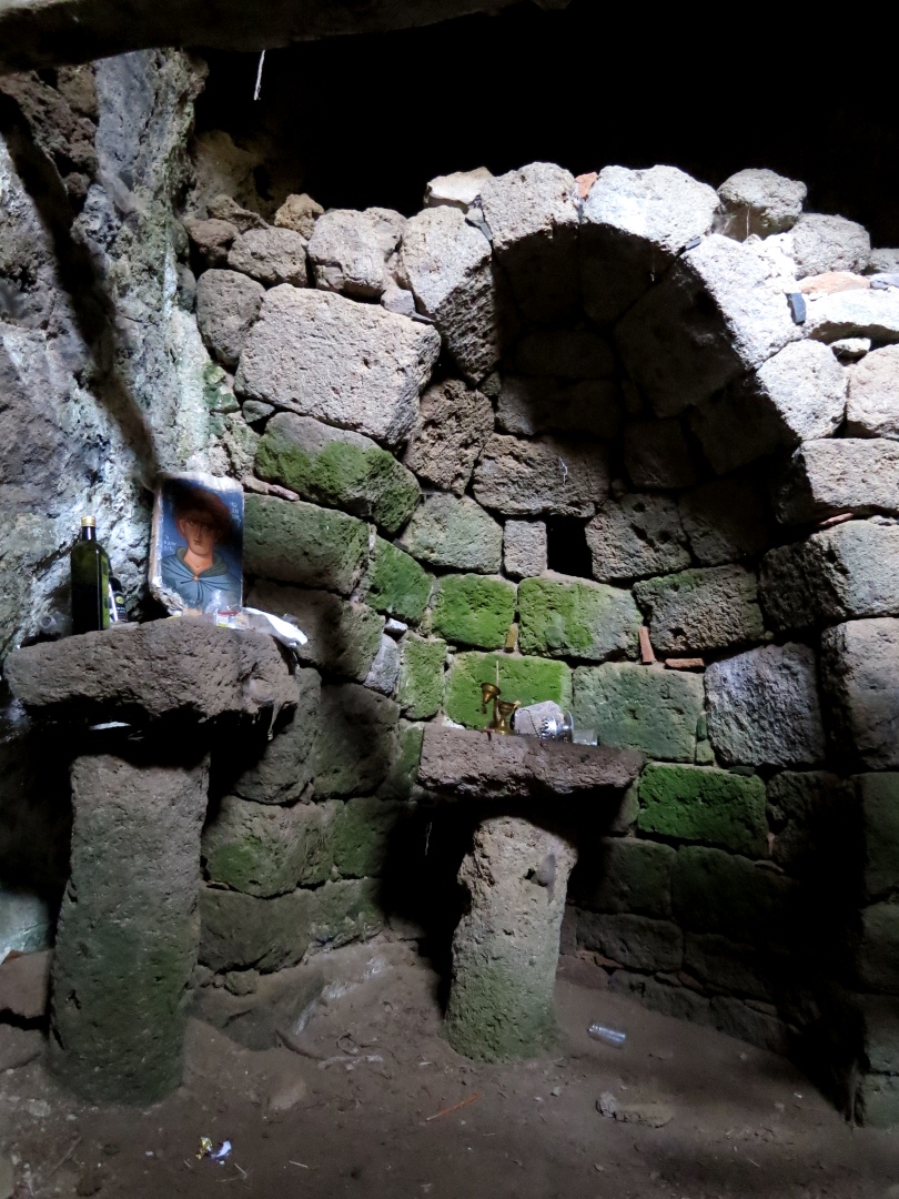 Set into the side of the caldera there is a tiny underground church built underneath an outcrop of lava with a central stone pillar. It is thought that this predates the Christian era and was probably a pagan shrine in the distant past. Now it has two tiny stone altars on one of which someone left a bottle of wine many years ago, still there though with the label not so intact, and more recently a bottle of olive oil. The church is furnished with candles and matches for the faithful to light in prayer so it is obviously still visited.