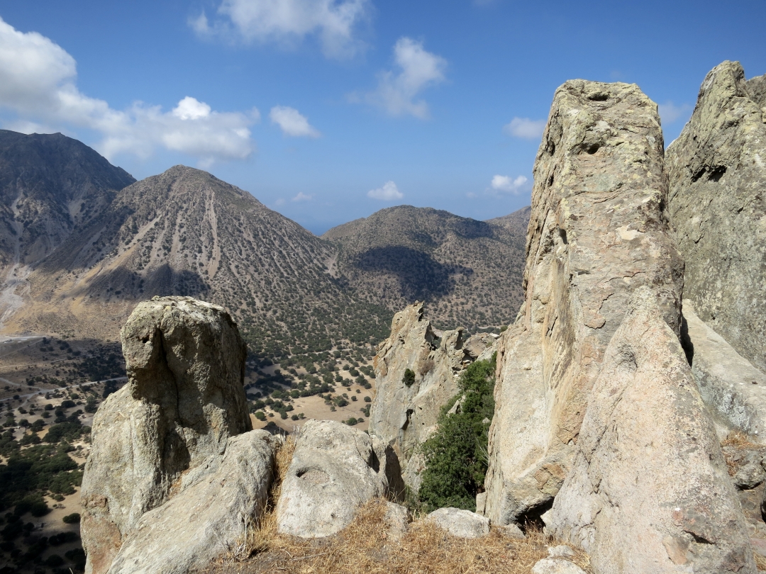 I reached the Partleta pinnacles in less than 2½ hours after starting off so indulged myself and climbed up them to have my snack in the magnificent eyrie at the top. The pinnacles drop down vertically to the caldera floor about 1000 feet below and the views are amazing.