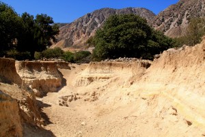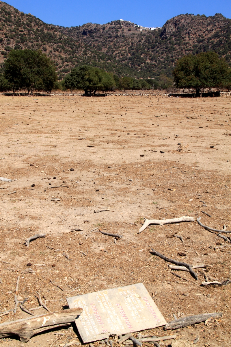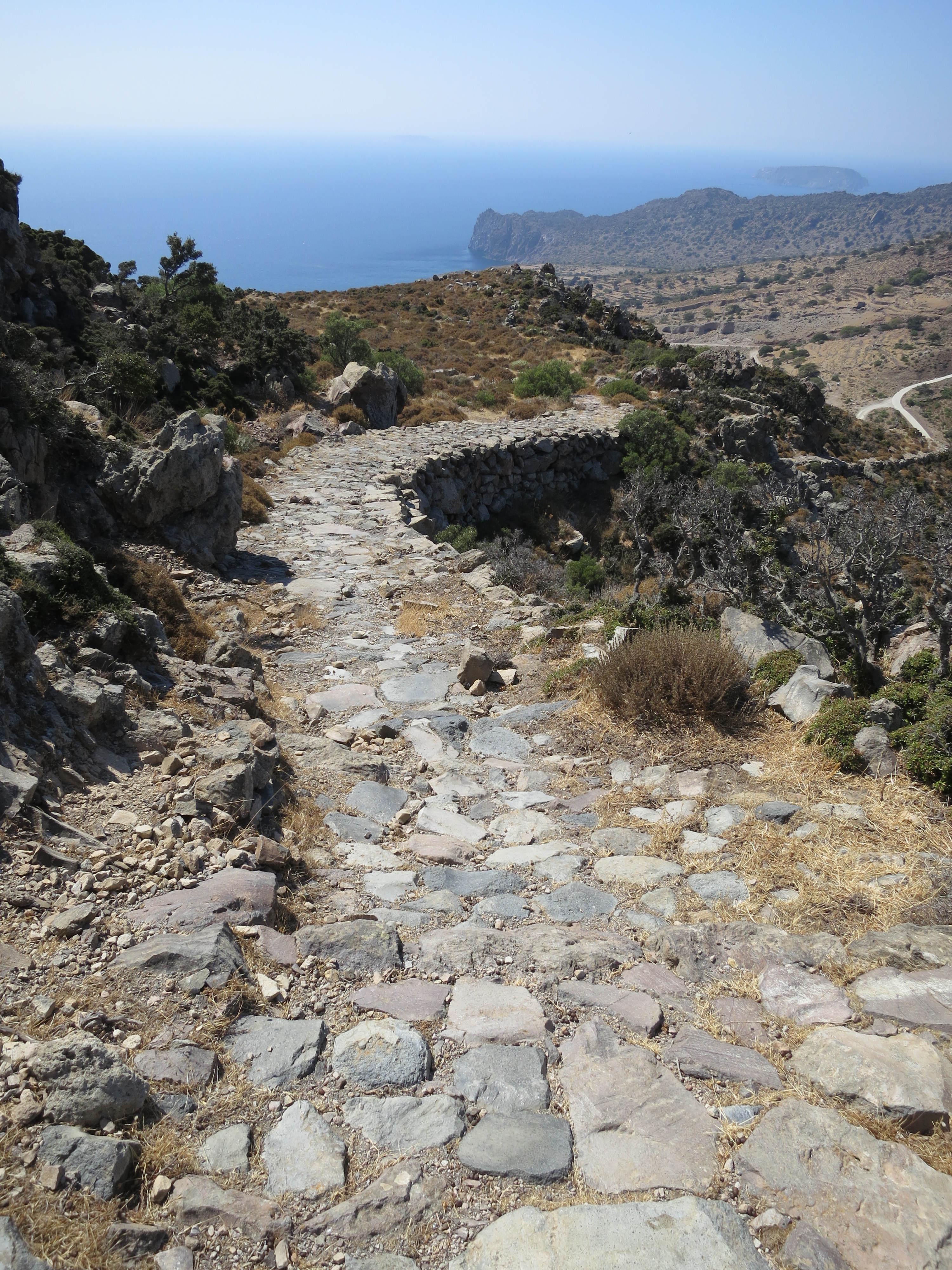 The walk back to Mandraki from Stavros is partly on a bulldozed track which obliterates the kalderimi underneath it in the interests of providing the island with ‘free’ geothermal energy. The geothermal energy never materialised. It was uneconomical. The kalderimi, as much a part of Greek cultural history as the grand archeological monuments, remains obliterated for all time. The track is a pain in the suspension but it links up good footpaths and gets me back to Mandraki.