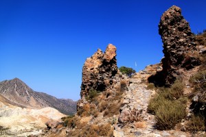 After a frappé in the top square (did I mention I’m addicted to frappés? Ice cold with a caffeine kick) I set off down the path which goes around the inside of the rim of the caldera towards Stavros monastery. The kalderimi from Nikia down to the saddle before going up to Stavros is a gem. I was on a mission but I did stop to photograph a pair of dramatic lava pinnacles either side of the kalderimi.