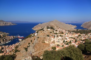 Symi has two parallel fjord-like inlets with steep limestone hillsides plunging down into the sea. The main harbour and the town sit at the head of the northern inlet and the much smaller settlement of Pedi sits at the head of the other with the old Horio, as is so often the case, sitting on the hill between the two.
