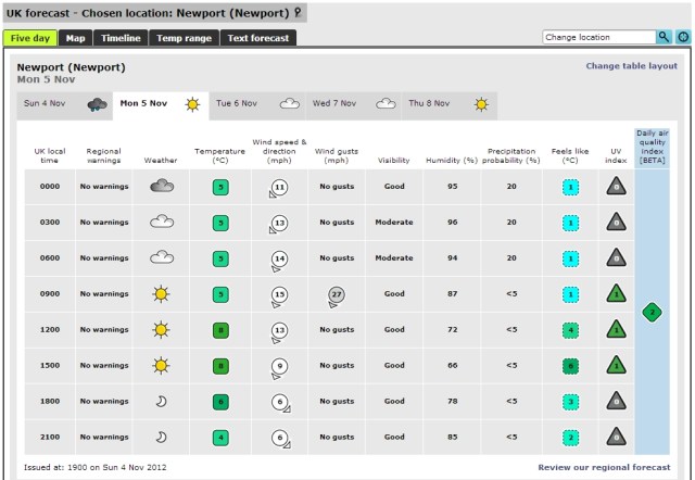 However, the new style forecasts also include UV index and it is comforting to note that at night the UV index is forecast to be Zero. Now that’s a forecast target I could achieve with 100% success.