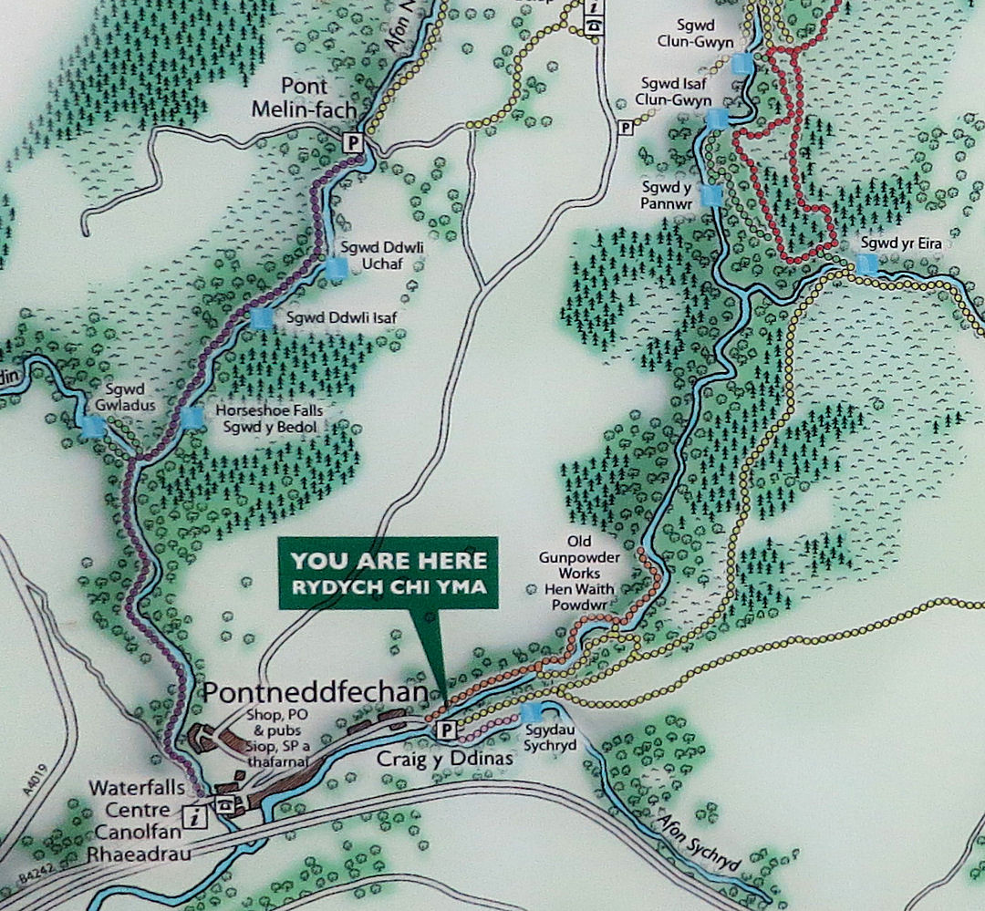 Part of the map on the information board in the car park. I walked up the river on the right of the map.