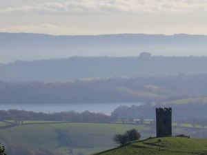 The sunshine couldn’t take the chill out of the air when we set out but the climb from the canal at 84 metres ASL steeply up to the Folly Tower and then up to Mynydd Garn Wen, at 425 metres the high point on the ridge, soon had us abandoning outer fleece layers. A tongue of mist lay like a giant white snake down the length of the Severn Estuary, blanketing Somerset and Devon from sight but views in other directions were as good as they get. As well as nearby mountain ridges Pen y Fan and Corn Du, the high peaks of the Brecon Beacons, came into view to the northwest as we left Garn Wen behind. The Malvern Hills could be seen to the northeast and the rim of the Wye Valley somewhat hazily to the east.