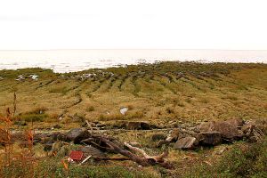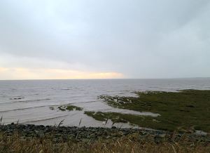 The incoming tide starts to cover the grassland on the foreshore