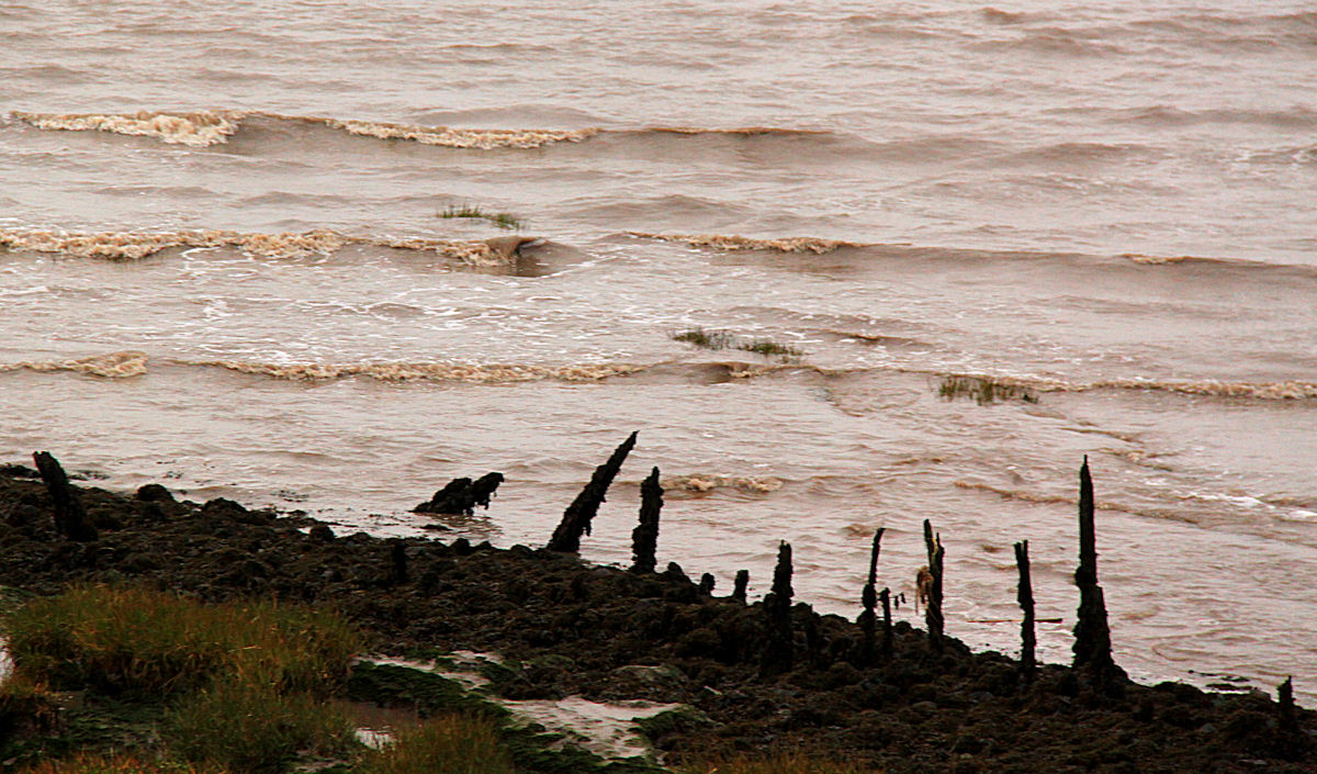 Battered and gnarled groins against murky sediment-rich waters