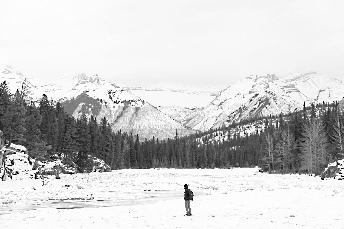 The path climbs a crag dropping straight down to the iced-up river as it reaches the Bow Falls and offers a good view not only of the jagged ice over the tumbling falls but also of the broad expanse of ice at the right angle bend in the Bow River at the bottom as the River Spray joins it from the south. There was more open water than the last time I was here indicating that temperatures have not been as low.