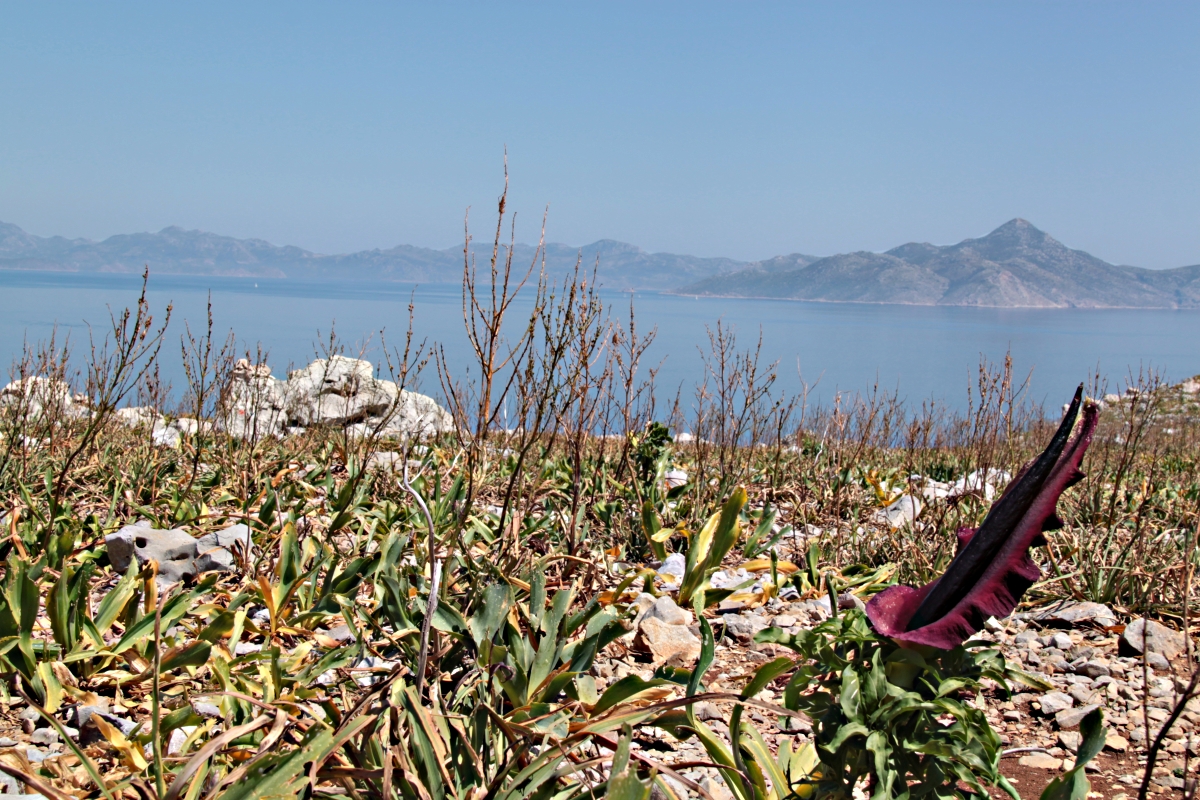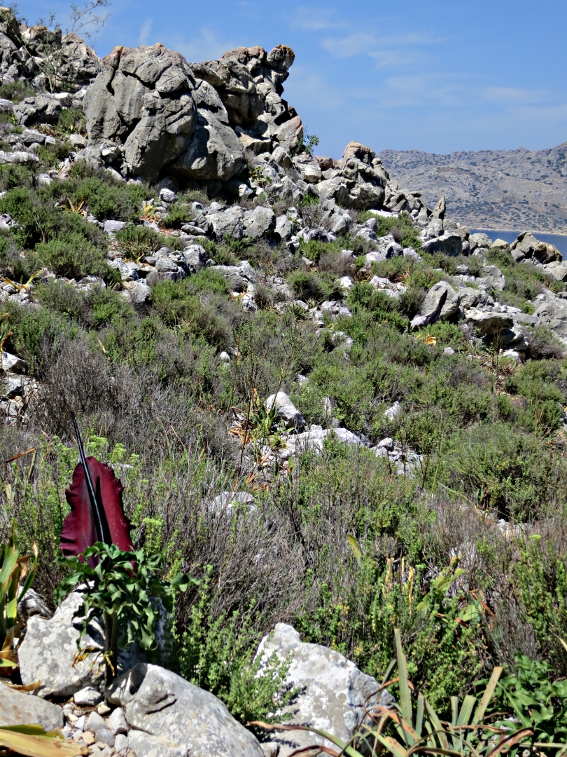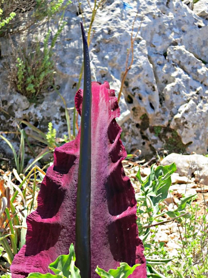 The most dramatic flowers by a mile were the Dracunculus vulgaris known by many names including perhaps the most descriptive, ‘Stink Lily’. Really an Arum not a lily, each flower can be over two feet long with a spadix ( the bit in the middle) supposed in Greece to represent a dragons tail (hence another name ‘Dragon Lily’), the beast sleeping inside the flower, tail hanging out. If the flowers themselves were not dramatic enough the smell is even more so. Just as a raven overhead is immediately and unquestionably identified by its basso profundo ‘croink’ so Dracunculus vulgaris is identified by its very distinctive and very offensive smell of rotting flesh. It is rumoured that vultures circle overhead looking for the feast and even dig the plant up the find the meat.