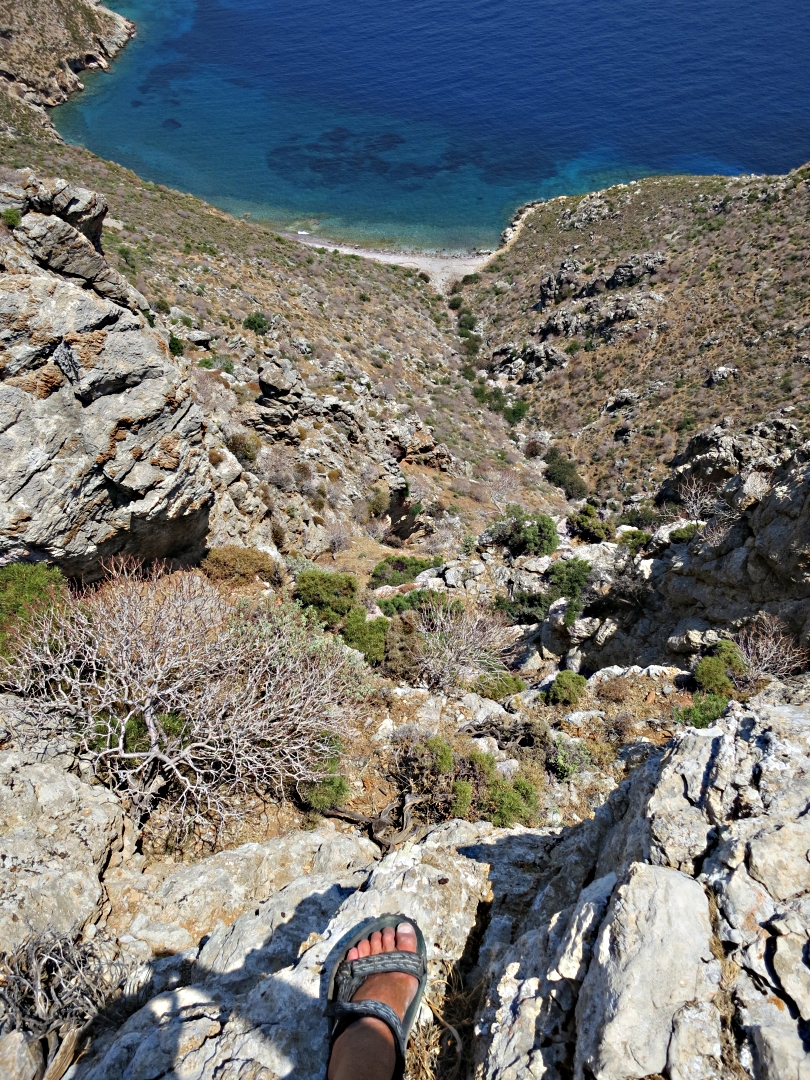 Then over-confidence took control. I have climbed the mountain 5 or 6 times and on most of those occasions have had trouble finding the path. Being older, wiser and assuming that I now knew what I was doing, I plunged on through the dense and aggressive vegetation to cross over the narrow gorge …. at the wrong point. I got it wrong again. I blame it on goats excavating the path to dig for roots in the parched summer months and malevolently knocking over the carefully positioned way-marking cairns to further confound the issue.