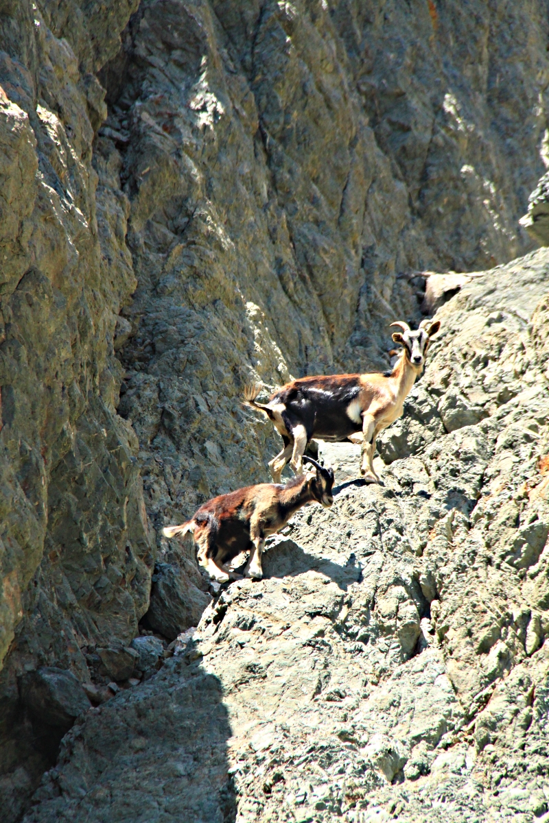 They pop up everywhere: looking down from lofty crags; leaping out of bits of shade beneath rocks or trees; wandering along otherwise secluded beaches; licking seepages of water from rocks faces; jumping out of a luxury pad in the many derelict buildings. It’s impossible to find a bit of natural shade on the island which isn’t carpeted in droppings and dark-brown goat urine stains. In enclosed spaces the smell is overpowering.
