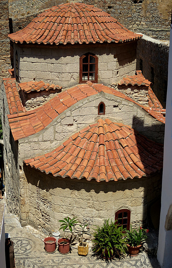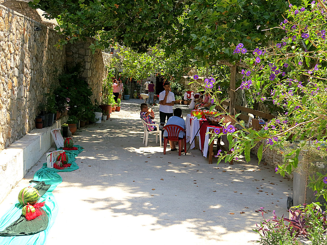This time the whole monastery was buzzing. The following weekend was the major festival on the island, the name-day for Agios Pandeleimon. But this Sunday there were what seemed to be preparations for a baptism. In the entrance courtyard trees and the spring were decorated with ribbons and there were symbolic displays and laden tables. The level below was a hive of activity with food preparation and long tables laid out with elaborate place-settings. Clearly large numbers were expected. As I was only using the bus one way I could have waited to see what was going on but I regard that as voyeuristic. This was a celebration for local people, not tourists. I could have engaged people in conversation to find out what was occurring (an expression familiar to followers of ‘Gavin and Stacey’ or residents of Barry, South Wales) but I’m afraid I didn’t. I was here for a walk and it was already into the hottest part of the day. I needed to be on my way.