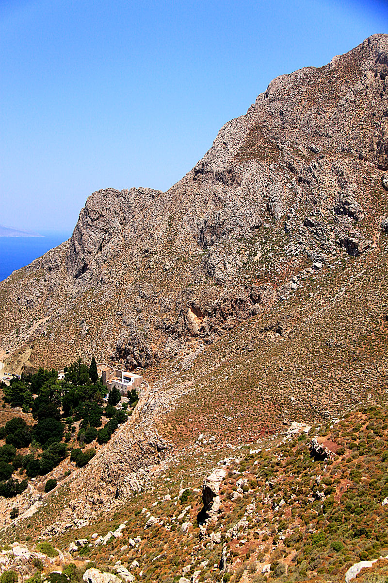 At 11.00 every Sunday the bus leaves Livadia for the monastery, stays an hour and then returns. Since the demise of the island’s taxi service it’s the only way to get there as the start of one of two possible walks. On my second Sunday on the island I climbed on the bus and, alighting at the monastery 45 minutes later, asked for «ένα απλό», a single (you pay when you get off, not when you get on). The die was cast.