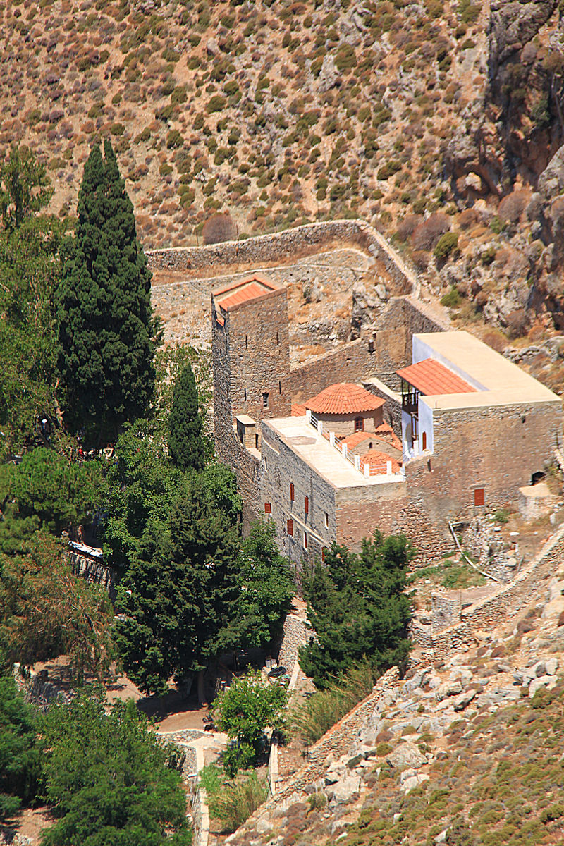 First a few more deep swigs of water from double-cupped hands under the spring gushing out of the rock by the entrance, conserving my bottle of iced water for later. I quickly found the start of the path, up a short flight of wooden steps to the left of the main gate and then along the high back-wall of the monastery enclosure.