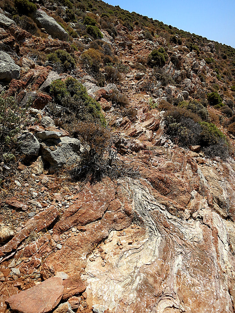 From there the monastery was out of sight and I was on my own, no sign of any settlement or activity. The sense of isolation was invigorating, focusing the mind. More than usual on the islands I was conscious of the fact that if anything went wrong it could be serious. The narrow, path winding up, down, and around the mountainside, occasionally marked by small cairns, increasingly rarely by fading red dots, was like a tenuous thread linking me to civilisation. I was confident that if I lost the path, or if it petered out, I now had enough experience of going off piste to find a way but it would be slow going, not a welcome prospect.