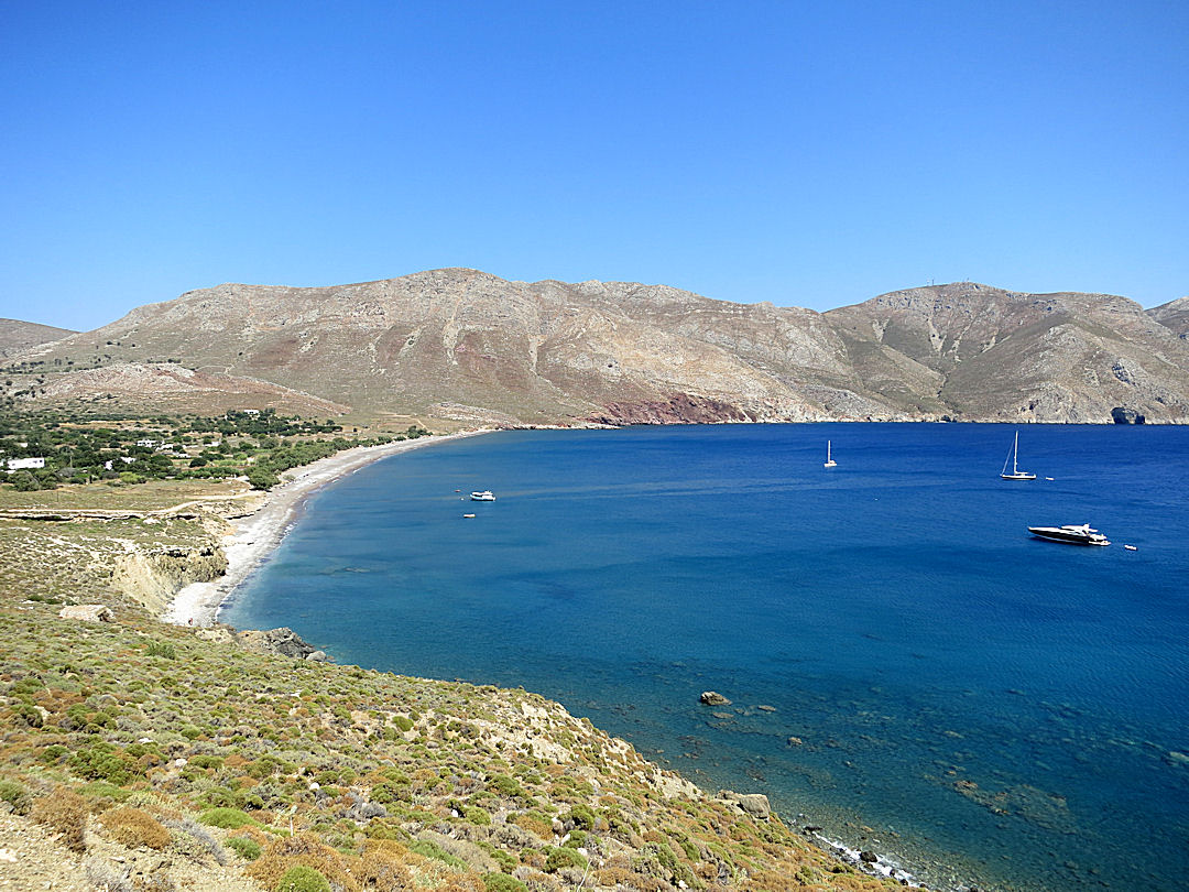Once a week there is the opportunity to do a walk on Tilos which I have intended but not got round to doing for a number of years. It’s a truly ‘wild walk’ from Agios Pandeleimon, the large monastery dedicated to the patron saint at the north end of the island, around the flank of Profitis Ilias, the highest mountain, to Eristos, the longest beach. With the mountain on one side, the sea on the other and no settlements, there are no escape routes. You either go on or you turn back. Though apparently once a well made stone-paved path there is now no trace of it and parts of the route are known to be difficult to find and follow.