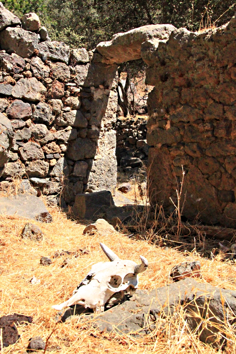 Cows and goats wander around this ancient village but I suspect that no-one comes here much, if at all, even though the tarmac road is only a couple of terraces above and the tops of the coaches taking trippers for their volcano experience can be seen as they thunder by. Certainly the farmer doesn’t come down here. He rides around the hairpin bend on his scooter, backwards and forwards calling to his animals from the saddle.