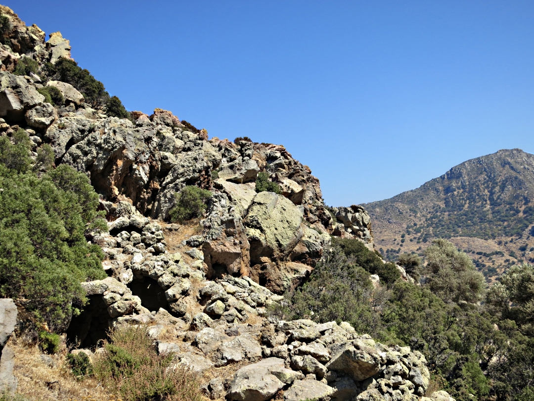 Instead, head on a path into a col on the return leg to Mandraki via Evangelistra. It’s a steep pull up with a long section of loose scree. Immediately after topping the scree is another small cluster of dwellings, these all built underground, onto small caves or under overhanging rocks. The terraces are here are very narrow and the houses smaller, probably abandoned long before those on the caldera floor partly because the soil is poorer partly because they are so remote.
