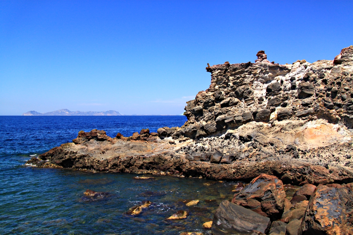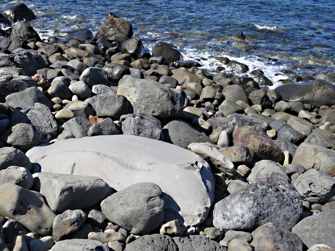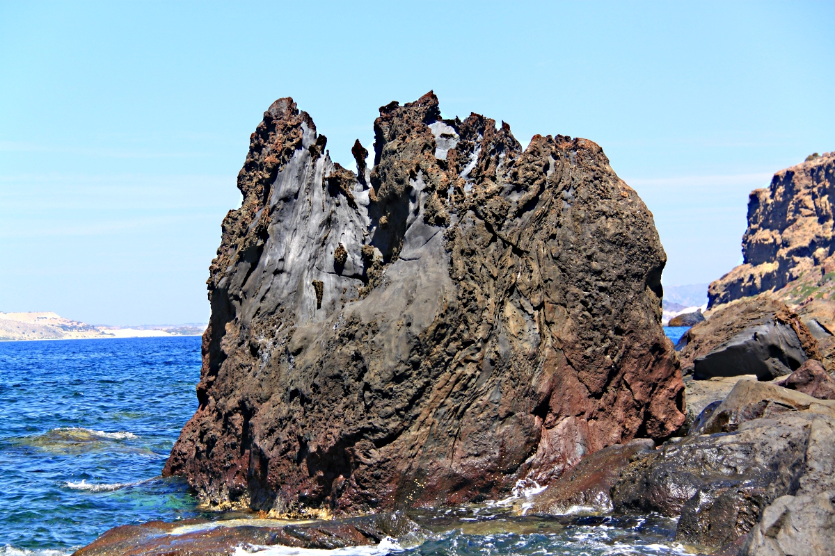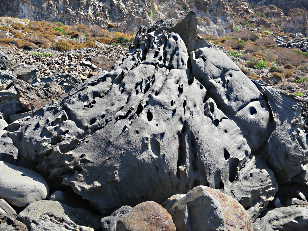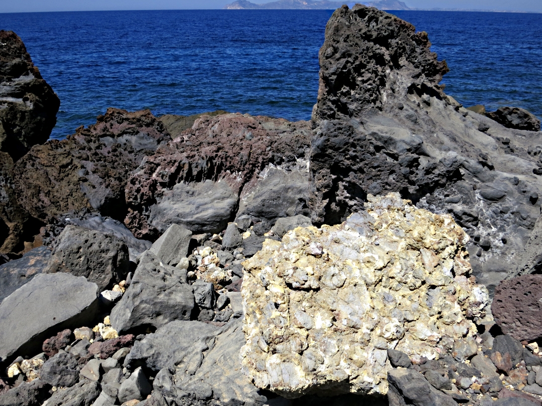 After two weeks of trekking in the mountains around Nisyros every day, much of it in noon heat, I was ready for an easier walk. I headed south along the west coast of the island, no footpath, just hopping and teetering from boulder to boulder. I had been that way before a few times but was surprised that little was familiar. Winter storms had brought down more of the cliffs with lava blocks, some the size of a car, balanced precariously on one another before they settle after a few more winters. Blocks four or five times my bodyweight could be rocked backwards and forwards by balancing on them …. or slide ominously.