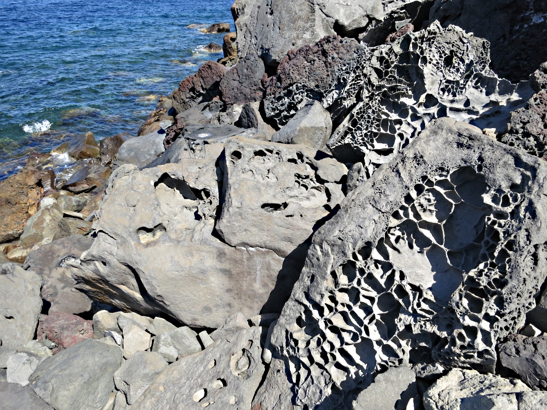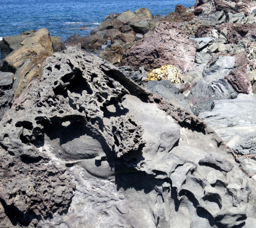 The main problem, apart from the prospect of triggering fresh rockslides, was to keep moving. The rocks were a mesmerising array of colours, shapes and distortions which had a vrachophile like me (Google it), stopping to look and photograph every few seconds. Many were fragments of lava bubbles, created when gas erupted from the liquid lava which then cooled rapidly. Now centuries-old rock. Many pieceslooked like hieroglyphic messages inscribed on tablets more than a metre across.