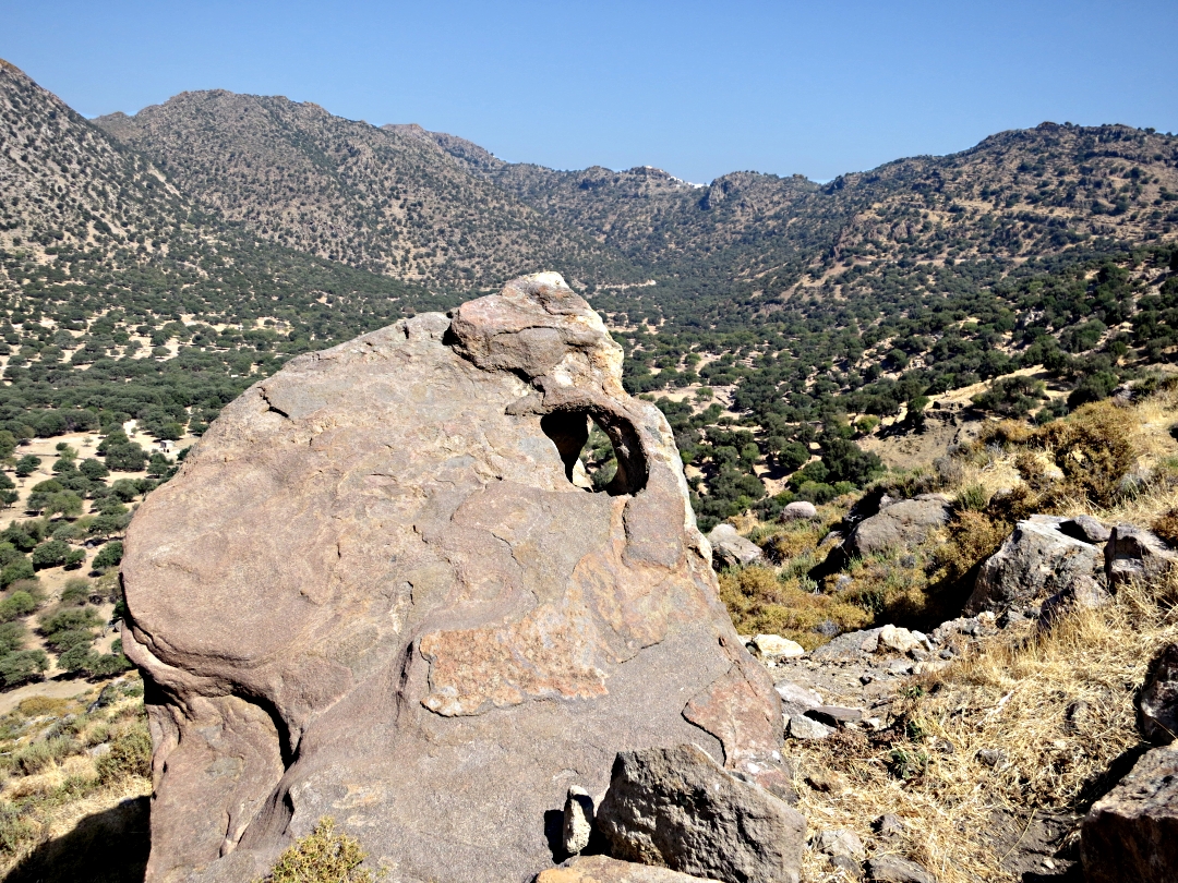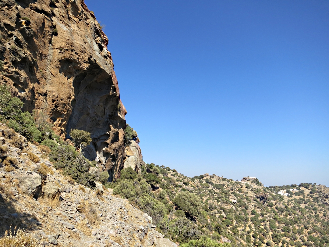 The ground is parched, dead trees lie everywhere.  Everywhere also there are old houses, single roomed, stone-built, barrel-arch constructions, surprisingly many with 6 or even 8 feet headroom, family homes for large families.  Some are free-standing structures in the middle of the caldera floor, others are built under the agricultural terraces along its flanks. After a while they become familiar, part of the background, almost unnoticed, but to see them for the first time is eye-catching  Some were lived in certainly until the 1950’s but now most are abandoned, a few used for agricultural storage.  One cluster of houses towards the eastern end of the caldera features large stone artefacts and a ‘throne’ carved out of a large boulder.  It breathes history just as the craters breathe sulphur gas..