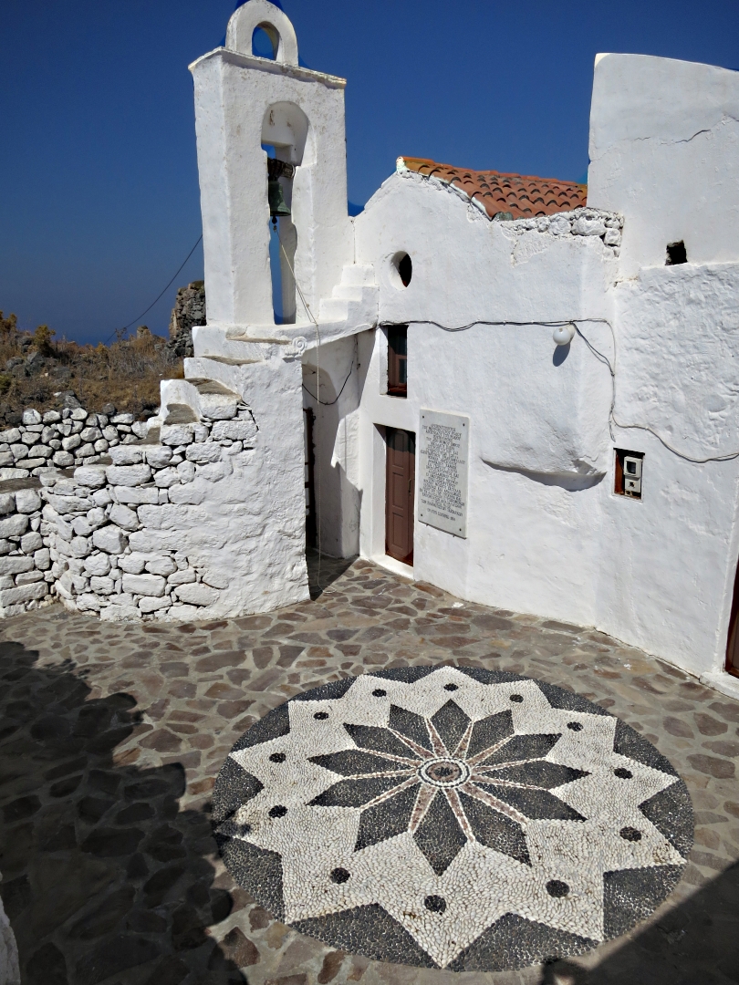 At the top of the village are the remains of a castle, currently being partly renovated,  the white-painted stone entrance perched on the edge of a vertical drop into the caldera with the  active craters 3 kilometres in the distance.  Next to it is a small monastery with a very fine traditional hochlakos courtyard and spiral stone steps up to the bell tower.