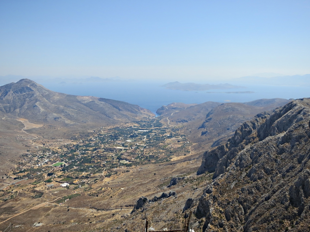 On Kalymnos I took the opportunity of having got accustomed to the heat of a Greek summer, by the end of August past its most intense anyway, to tackle a long and challenging walk circumscribed by a very limited bus timetable. The 09.20 bus from Emborios at the northern tip of the island got me to Chora with its crusader castle by 10.15, then trek to the top of Profitis Ilias the highest mountain on the island, long drop down to the Vathy Valley on the other side, trek along the valley floor and then one of the best kalderimia in the Aegean, the Italian Path, back over the ridge to Pothia, the main town. Made satisfyingly good time so able to enjoy a beer and a WiFix on the harbourside before the 17.00 bus to Emborios. Great evening with friends and then bus and two cats back to Nisyros the next day.