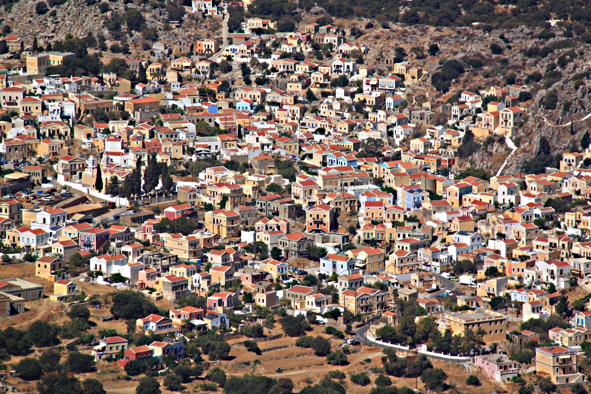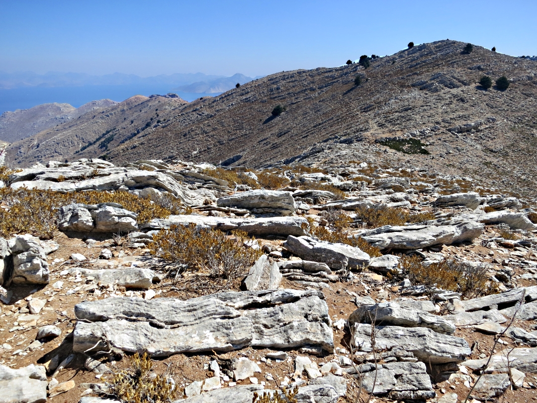 The satisfaction is in getting there the hard way, straight up the north scarp from Horio, the old village above the harbour. There is no path beyond the monastery at its foot and even the path to there is in a poor state since a road access was pushed in from the tarmac at a higher level. My preferred route is to climb a long rib of rock rising steeply from the monastery, more exposed though more reliable and secure, but closer to the top an upward diagonal traverse on very loose material is necessary before getting back onto rock outcrops. Like the rest of Symi the rock is limestone, in places sharp as razors, elsewhere smooth and tilted, near-vertical slabs. On lose ground thin shards, hard as steel, slide over one another, clinking metallically when they flip over.