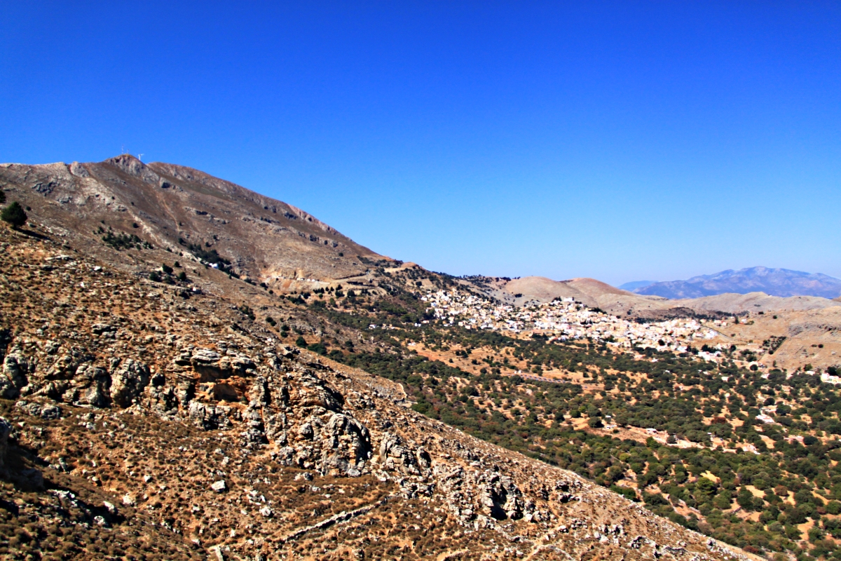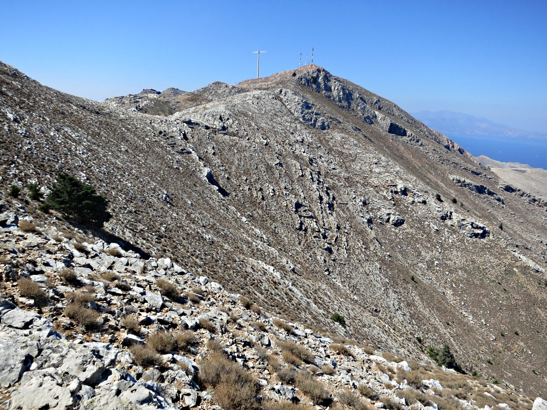 Ignore the masts and the wind turbine and in late summer sunshine from cloudless sky with a gentle breeze it’s a great place to be with views to the south of mountain-top monasteries such as Agios Stavros Polemou, to the east beyond the edge of Europe to the coast of Asia Minor, to the west the islands of Tilos and Nisyros, …. and the island’s landfill site.
