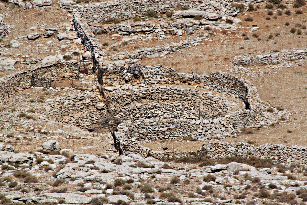 Eventually I reluctantly leave my eyrie and set out to walk northeast to the end of the ridge, again with no footpath. Having dropped down sharp limestone rocks from the top to long-abandoned agricultural terraces on the narrow ridge, initially the route is across inclined slabs of rock, jumping from edge to edge, heading for a thin path made by goats migrating from one part of the mountain to another.
