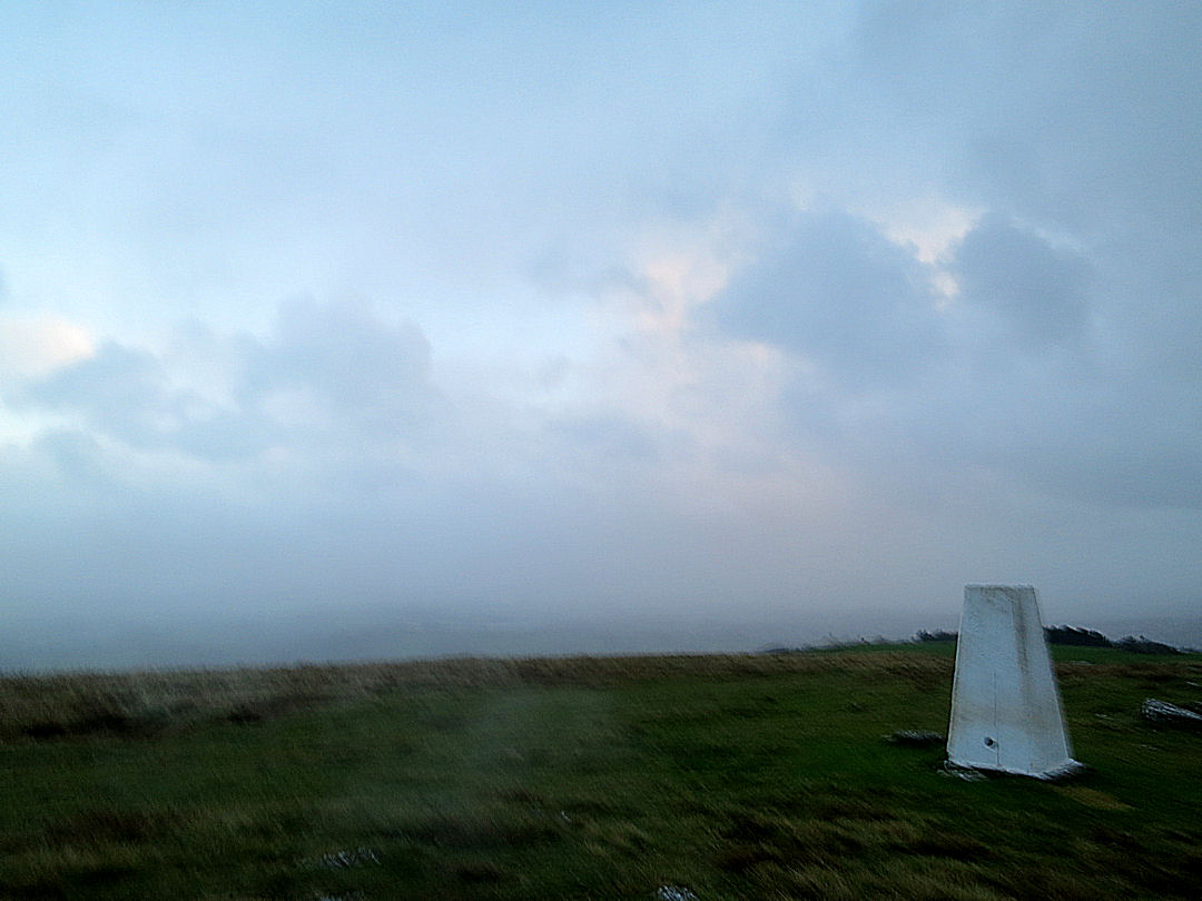 On top I could barely stand.  Air is forced upwards as it blows onto a mountain, a phenomenon used by gliders (paragliders, hang gliders and sailplanes) and known as ‘ridge lift’.  On the leeward side the wind dips down and, as well as creating a problem if you fly too low back over a ridge, can create a gap in the clouds.  I wanted to get a photo of this gap with the trig point in the foreground so I moved towards the short cliff on the western edge, fiddling to take my camera out of my pocket as I did so, but when I turned and put my back to the wind I found myself being blown across the top, running to stay on my feet, unable to stop myself.  I dived behind the trig point, crouching for shelter.