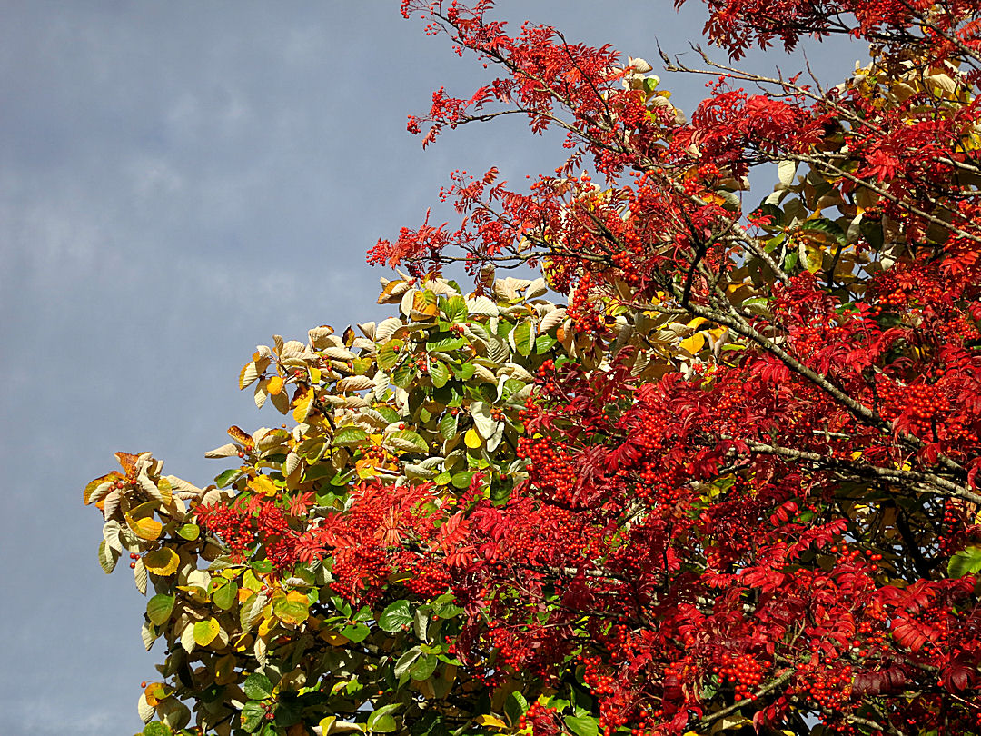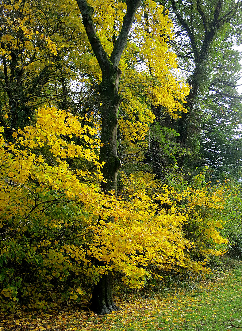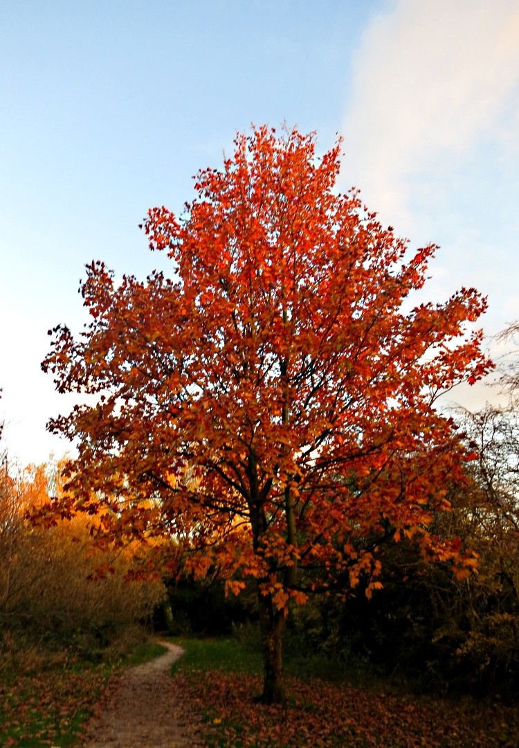 Not that I have been deprived of Autumn colour. What I pretentiously call the ‘Acer Glade’ in the garden, the bottom quarter next to the canal which I have been planting up to reduce the maintenance required when I’m old and feeble, is starting to look good with a multicoloured canopy over most of it as trees grow into each other. Even on grey days the colours are striking, when it’s sunny they are luminous.