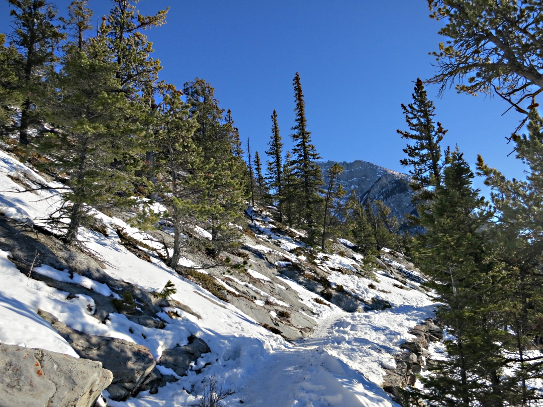 The gradient of the path gentles towards the top, the summit of Mount Rundle in view, rock slabs stripped bare of snow by strong winds