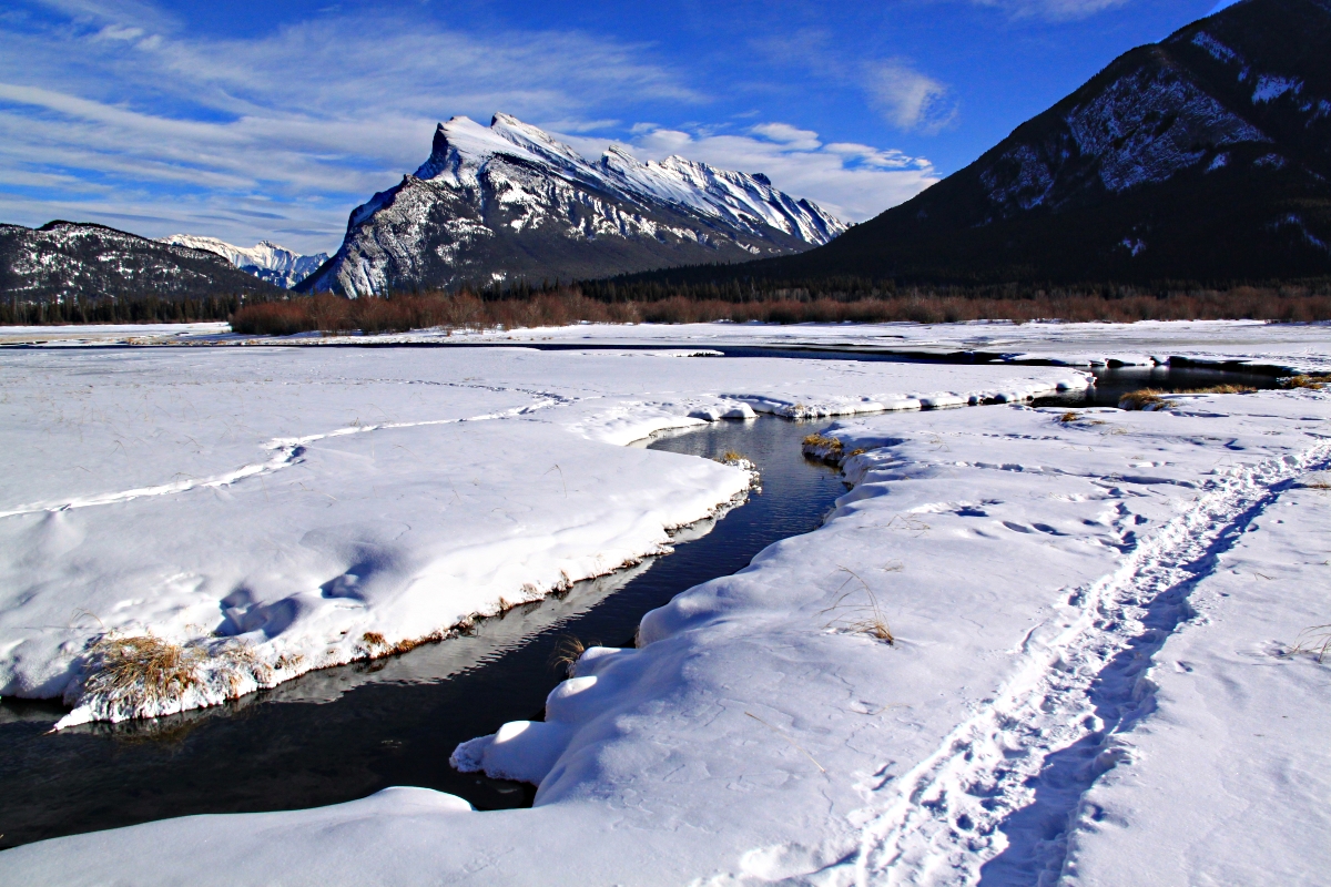 The path joins the Vermillion Lakes Scenic Drive, a metalled road, in winter covered in hard packed snow and ice, paralleling the Trans Canada Highway some 50 feet above. The Lakes are broad, frozen expanses of ice and snow but at various points spring emerge from the mountain above creating areas of open water, some as small ‘ponds’, others meandering through the ice-sheet. My arrival at the lakes coincided with dispersal of the cloud cover with consequent arresting diversions onto the ice to take-in and photograph the dramatic contrasts and reflections.