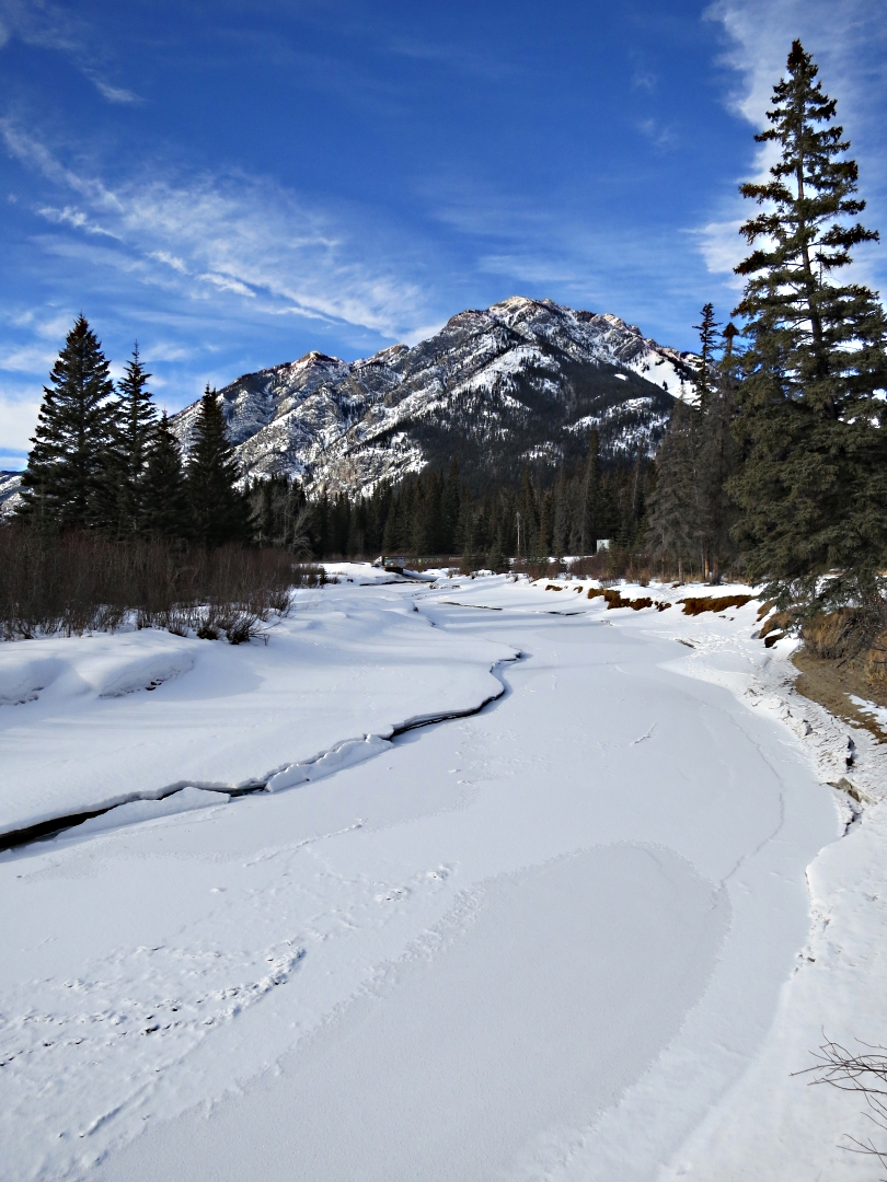 The morning’s blue sky had clouded over by the time I headed along the creek towards Vermillion Lakes. The previous Sunday the creek had open water along its length, reflecting blue and white among the trees (see). Now it had frozen over again, though a good few inches lower than the remnant early-winter ice along the edges, and a few centimetres of recent snow had accumulated.