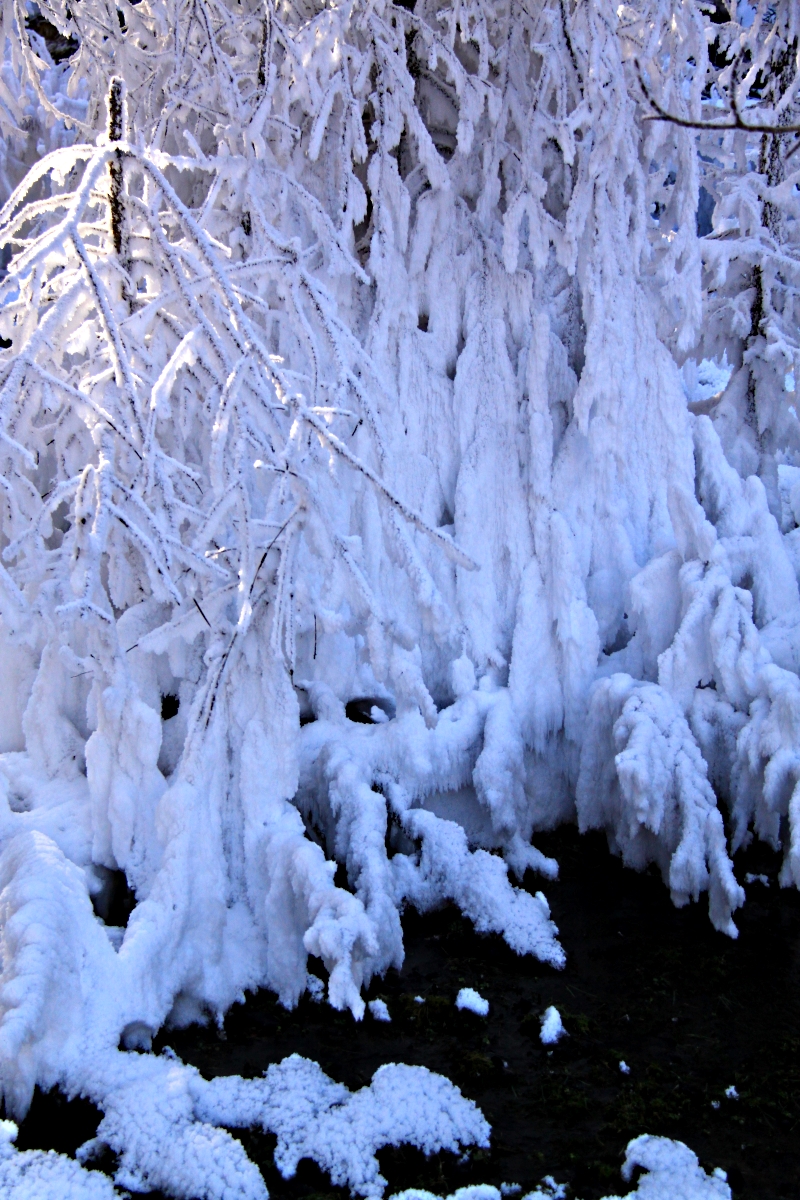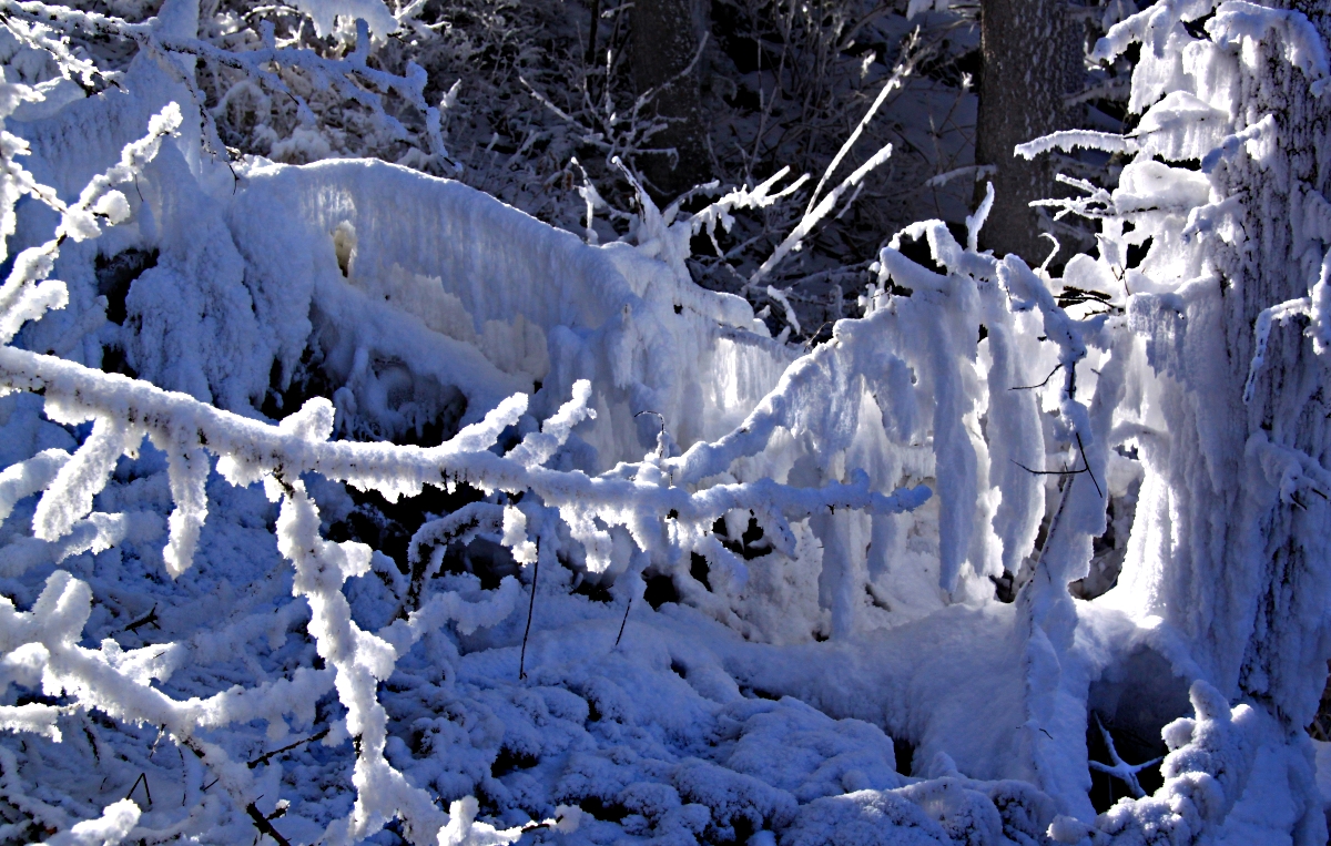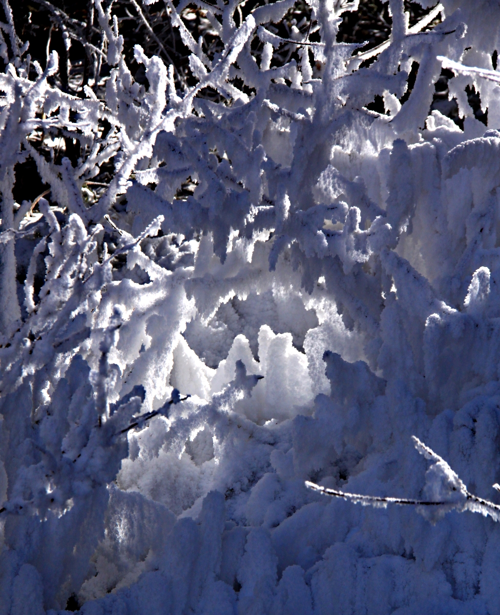 Dead tree thick with frost, the water vapour all frozen out of the air before it reaches the height of the trees behind,