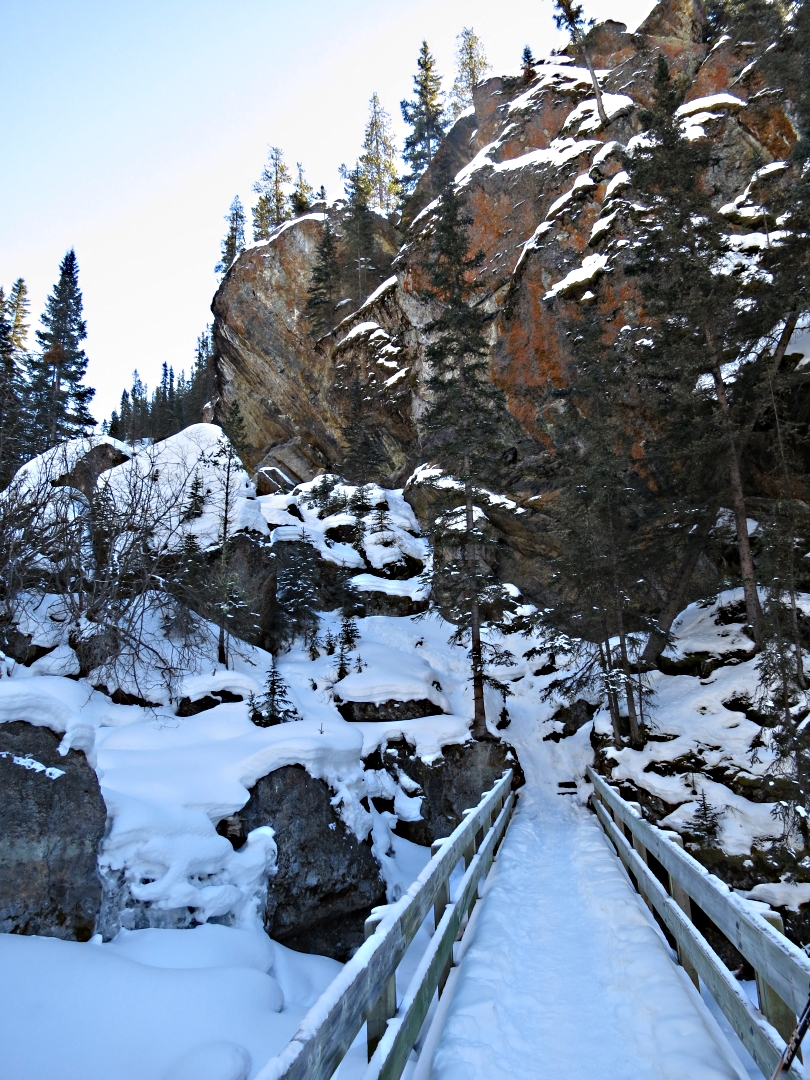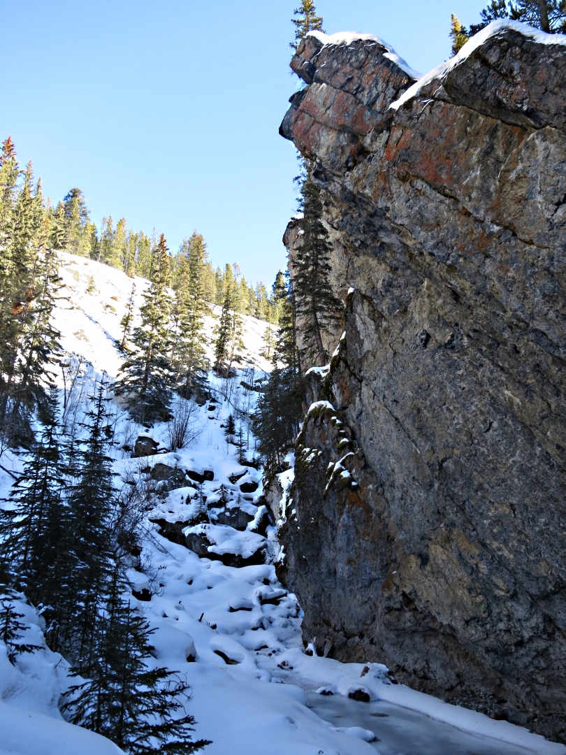 Before I reach the end of the trail I divert off to the left, steeply up through the pine forest following tracks barely the width of my feet in deep snow. Clearly not trodden for some time, there is 6 inches of fresh snow on top. I’m again grateful for my cleats and for the first time use trekking poles with snow-baskets. The trail is signed ‘Sundance Pass’ but the destinations are some tens of kilometres away. Closest is 12 kilometres to the Spray River, with a similar length return. With skiing tomorrow I don’t intend going that far. I follow it for an hour, sometimes steeply, sometimes more gently but always through the trees. When I reach a small clearing at what I guess is close to the highest point, I stand in the sun for a few minutes to eat a muesli bar and then turn back as my main objective is a little further up the canyon itself.