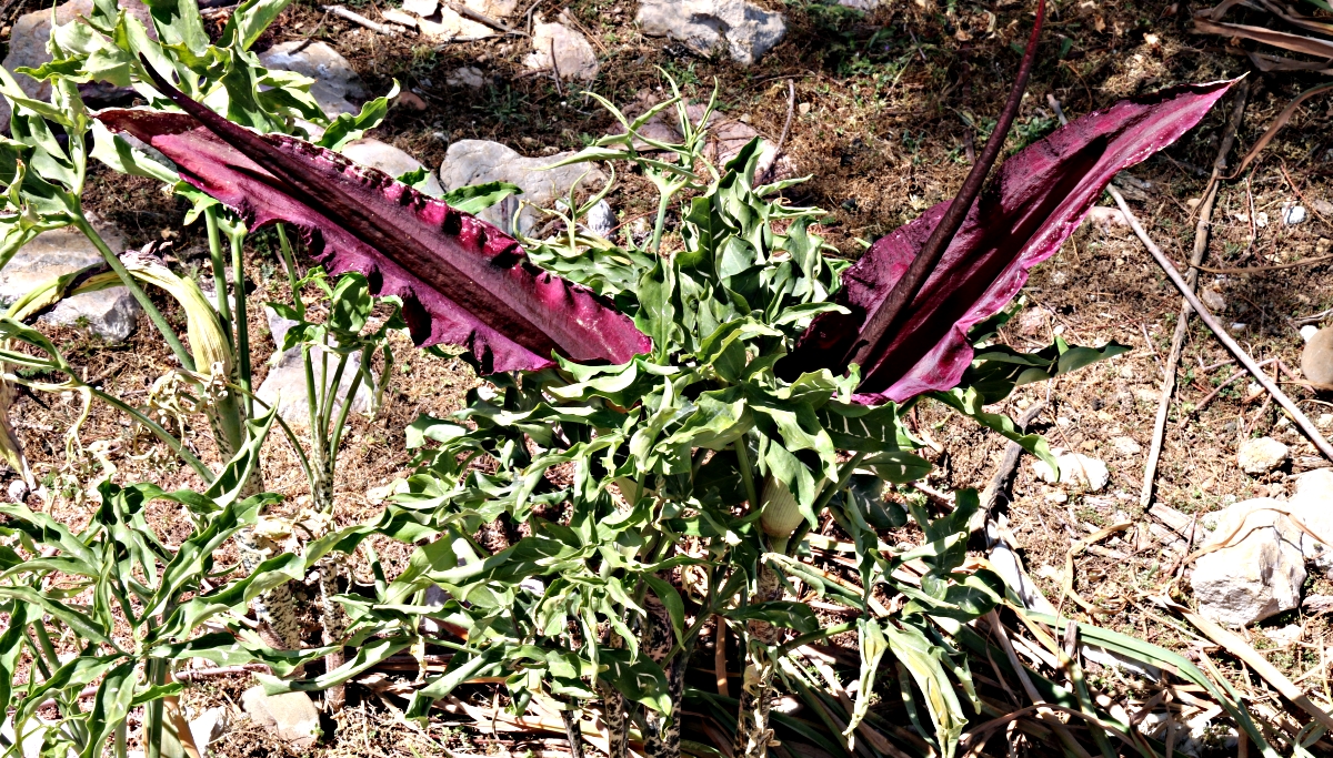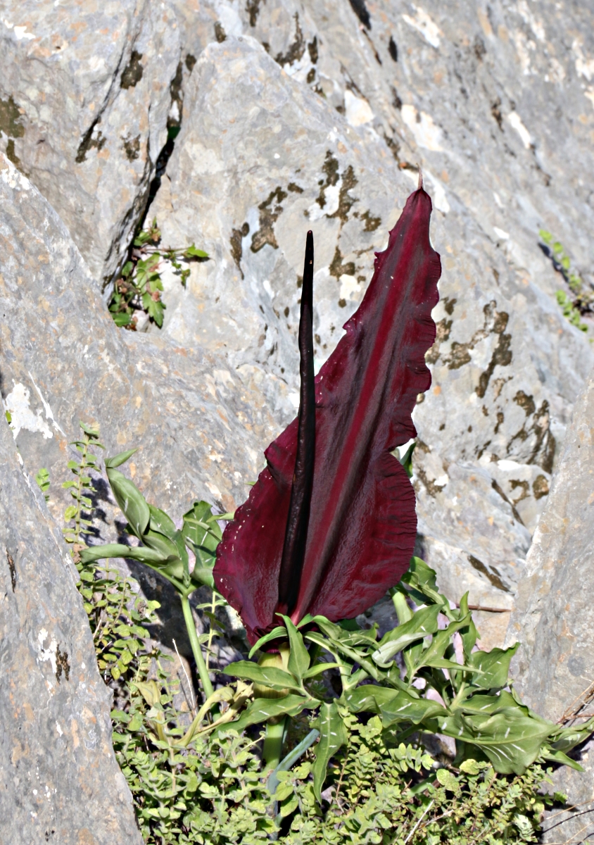 Not quite as dramatic but something which cannot be ignored if you go out in the mountains at this time of year is the smell of death. Sometimes you smell them before you see them, Dracunculus Vulgaris, a splendid species of the Arum genus known by many names including Dragon Arum because it is supposed to look like the tail of a small dragon disappearing into the spathe to hide, and Stink Lily ….. for obvious reasons. They grow everywhere, from field terraces to cracks in the rock, a beautiful rich, deep purple colour. Tens of thousands of them ranging from a few inches to 4 feet tall, with spathes of up to 2 feet and a spadix even longer. The smell is like the rotting flesh of a dead animal. Horrendous. I know someone who planted some bulbs in his garden back in the UK and dug them up after a couple of years because of complaints about the smell.