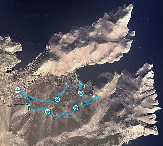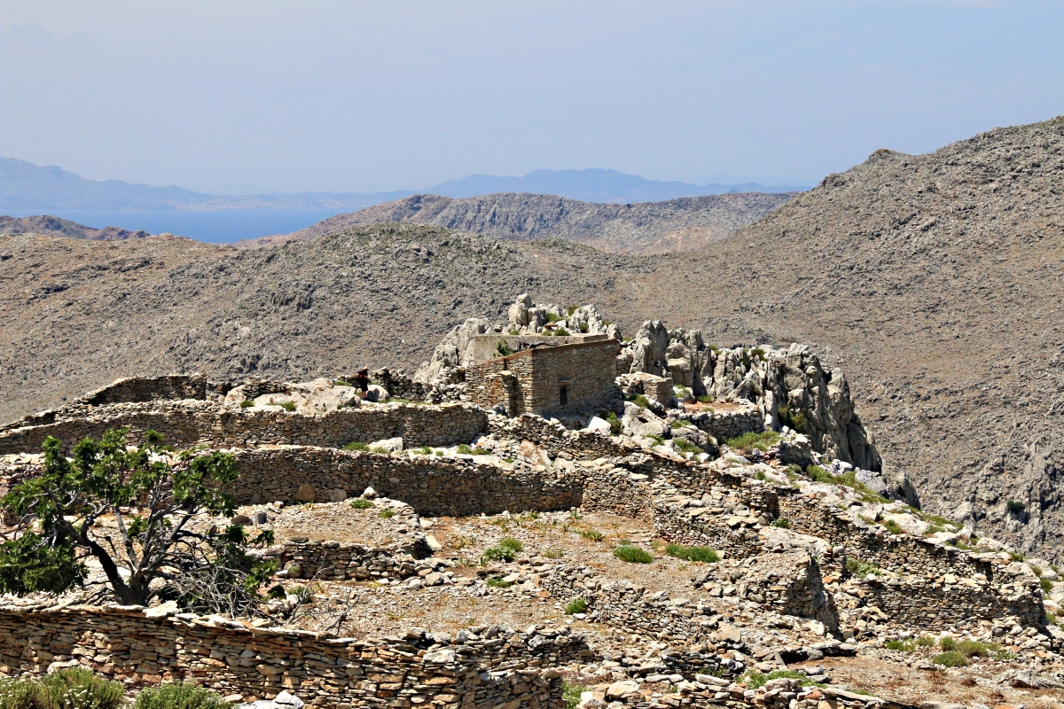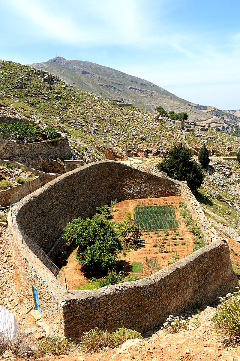 The track ends abruptly at the steps up to the monastery, the way on dropping down from above the far end of the courtyard. From here the once well trodden path is now ‘thin’, in places unclear and needing some ability to read the ground. It winds its way first through a gap in the rocks and then further along the flank of the ridge before dropping down to cross gulleys and finally climbing up to Gria behind crags which tower above Pedi Bay.