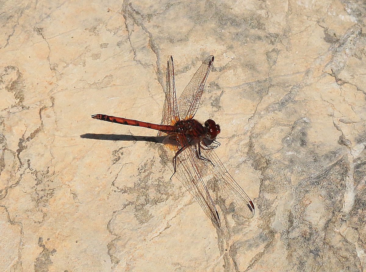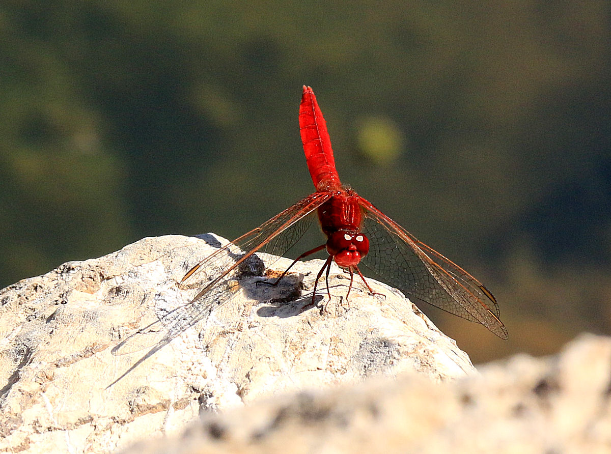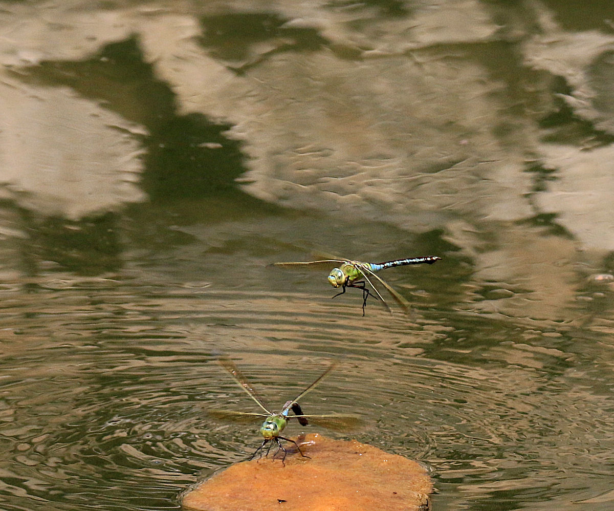 Dragonflies were skittering low over the surface of the water, landing on rocks for a few seconds before taking off on frantic flight again. I noticed that they homed in on the same two or three rocks so I carefully climbed down and perched low to the water to try to photograph them. Though at times in danger of tipping forwards face first I stayed dry and the dragonflies got used to me being there, part of the background and no threat.
