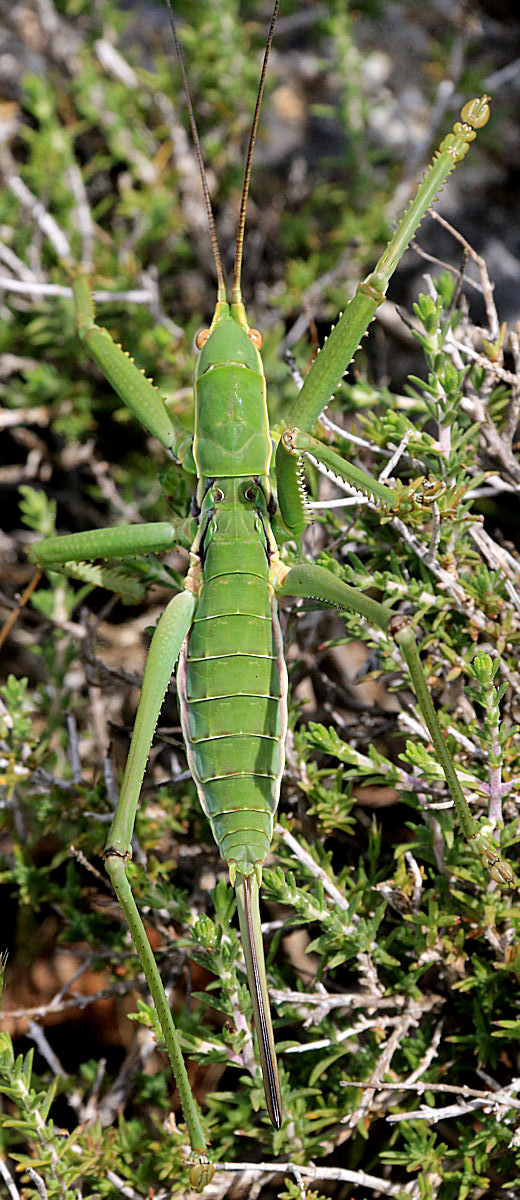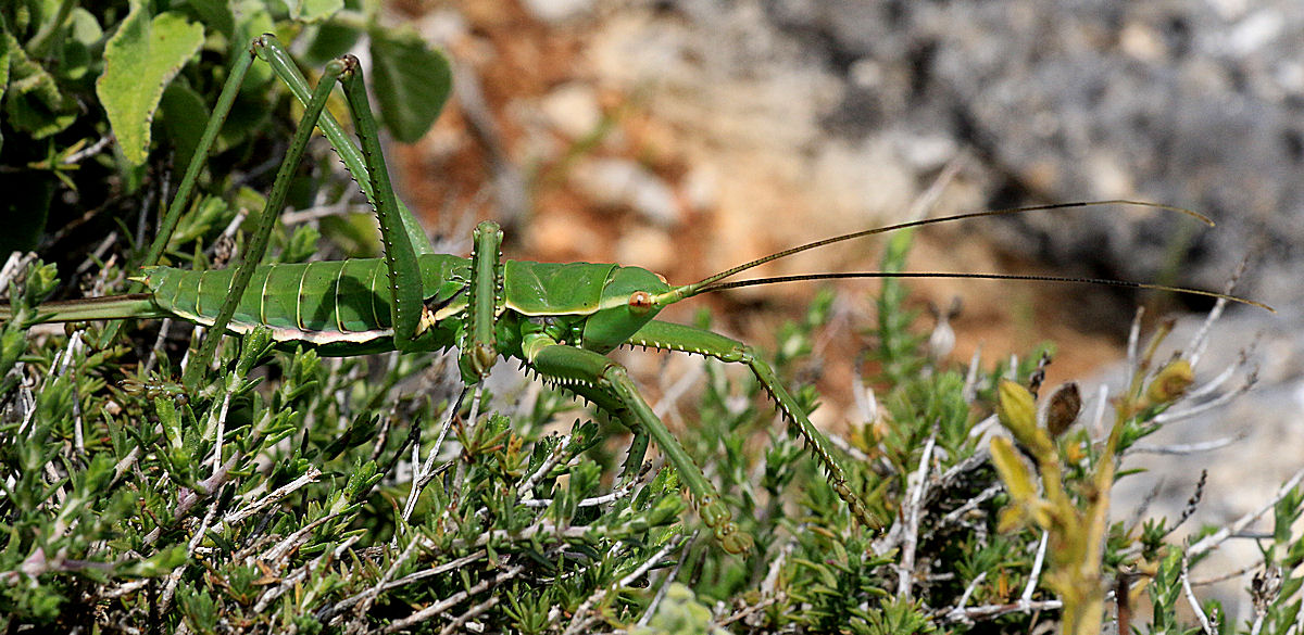 Sometime later, having left the kalderimi behind and walking very carefully on a section of path over very serrated, sharp limestone surrounded by low-growing vegetation, my eye was caught not by a flash of colour but by slight movement off to the right. A mantis was twitching its left front leg and thereby attracted the attention of the paparazzi. Having been spotted it froze and became almost invisible against the background of green twigs. It wasn’t preying, or even praying as some web sites seem to think, but my attempts at identification have it as possibly a European Mantis, Latin name Mantis religiosa which just adds to the taxonomic confusion. Or maybe there are two types, one which eats its mate after sex and the other which is devoutly religious.